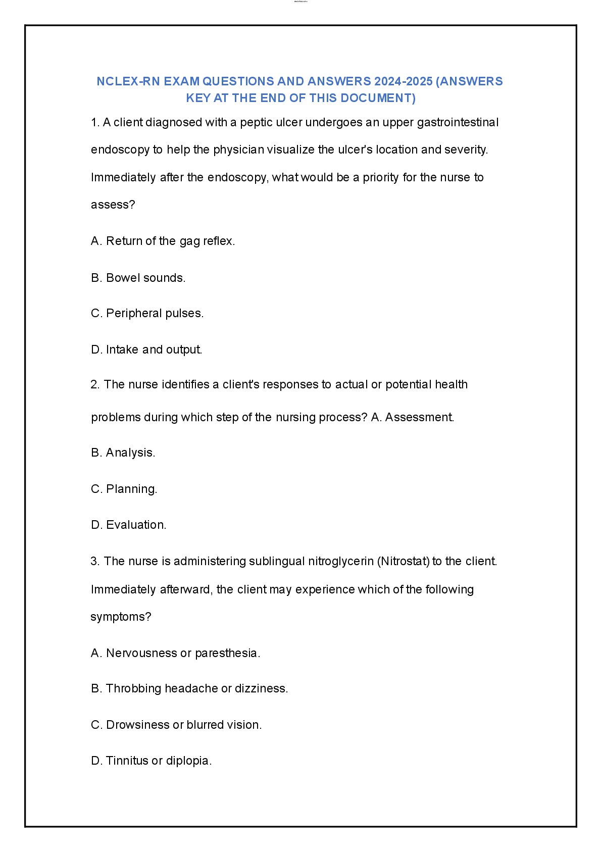 NCLEX RN > EXAM > NCLEX-RN EXAM QUESTIONS AND ANSWERS 2024-2025 (ANSWERS KEY AT THE END OF THIS DOCUMENT) (All)