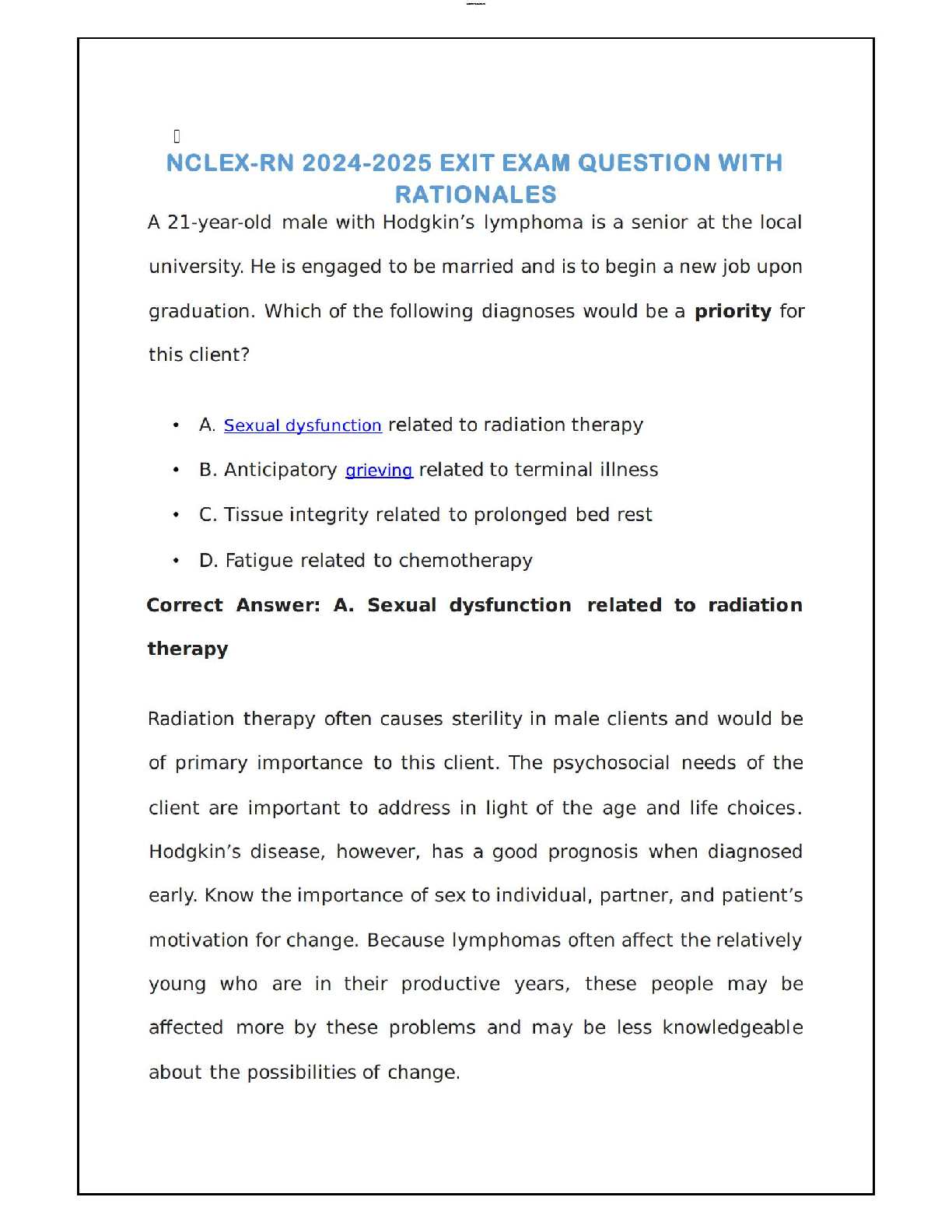 NCLEX RN > QUESTIONS and ANSWERS > NCLEX-RN 2024–2025 Exit Exam Practice – Questions with Detailed Rationales (All)