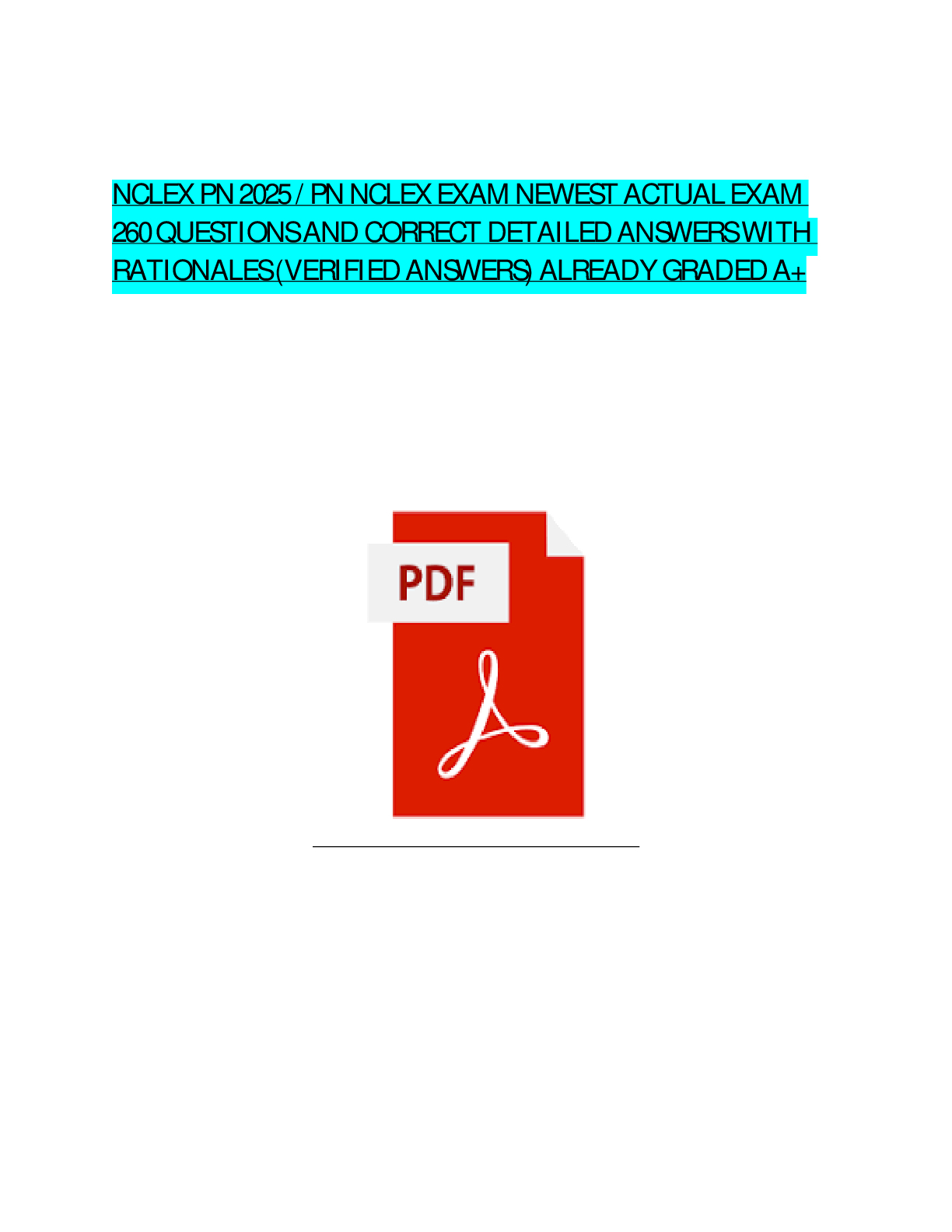 NCLEX RN > EXAMs > NCLEX PN EXAM, THE NEWEST ACTUAL EXAM 260 QUESTIONS AND CORRECT DETAILED ANSWERS WITH RATIONALES (VERIFIED ANSWERS) ALREADY GRADED A+ 2024|2025 (All)