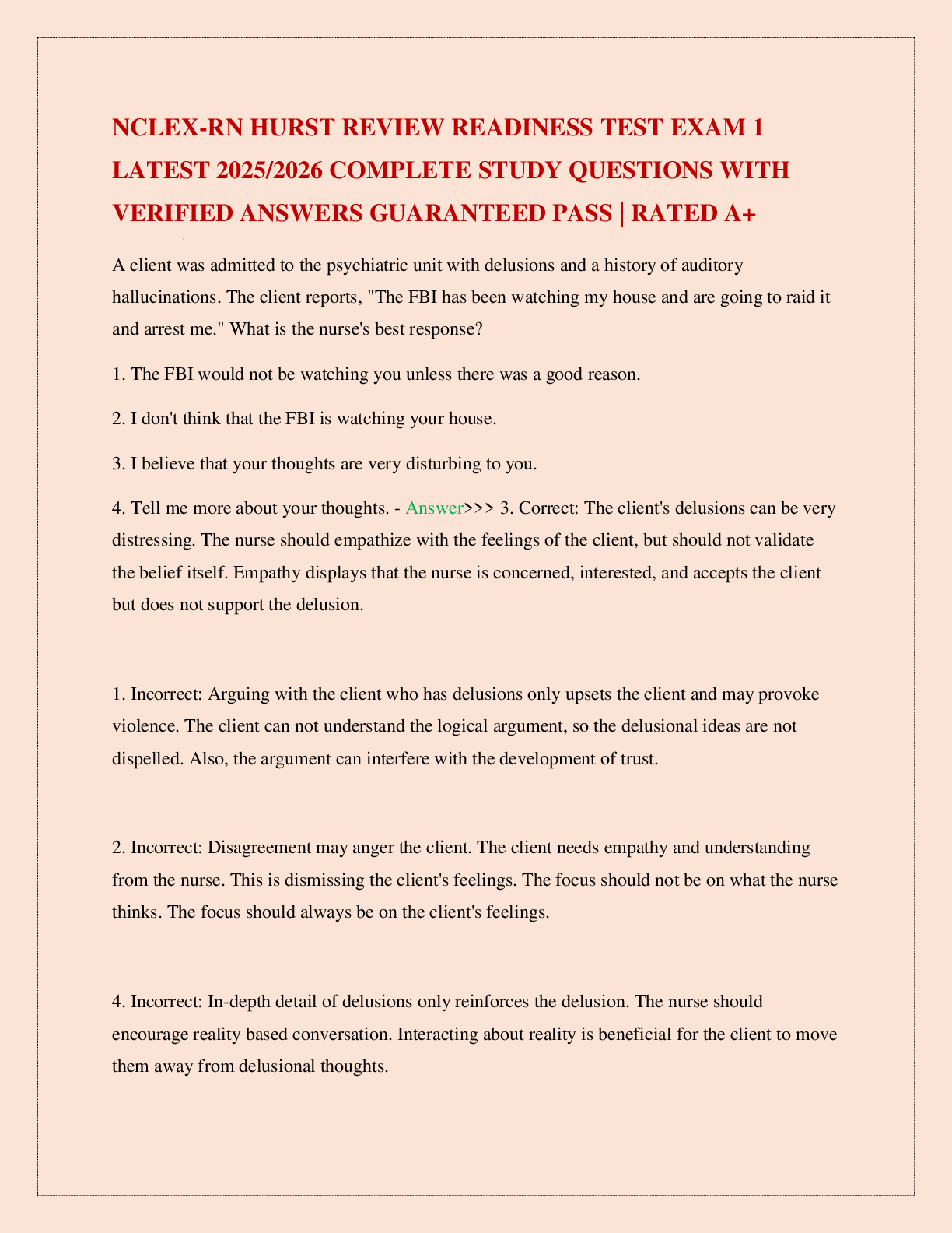 NCLEX RN > EXAM > NCLEX-RN HURST REVIEW READINESS TEST EXAM 1 LATEST 2025/2026 COMPLETE STUDY QUESTIONS WITH VERIFIED ANSWERS GUARANTEED PASS | RATED A+ (All)