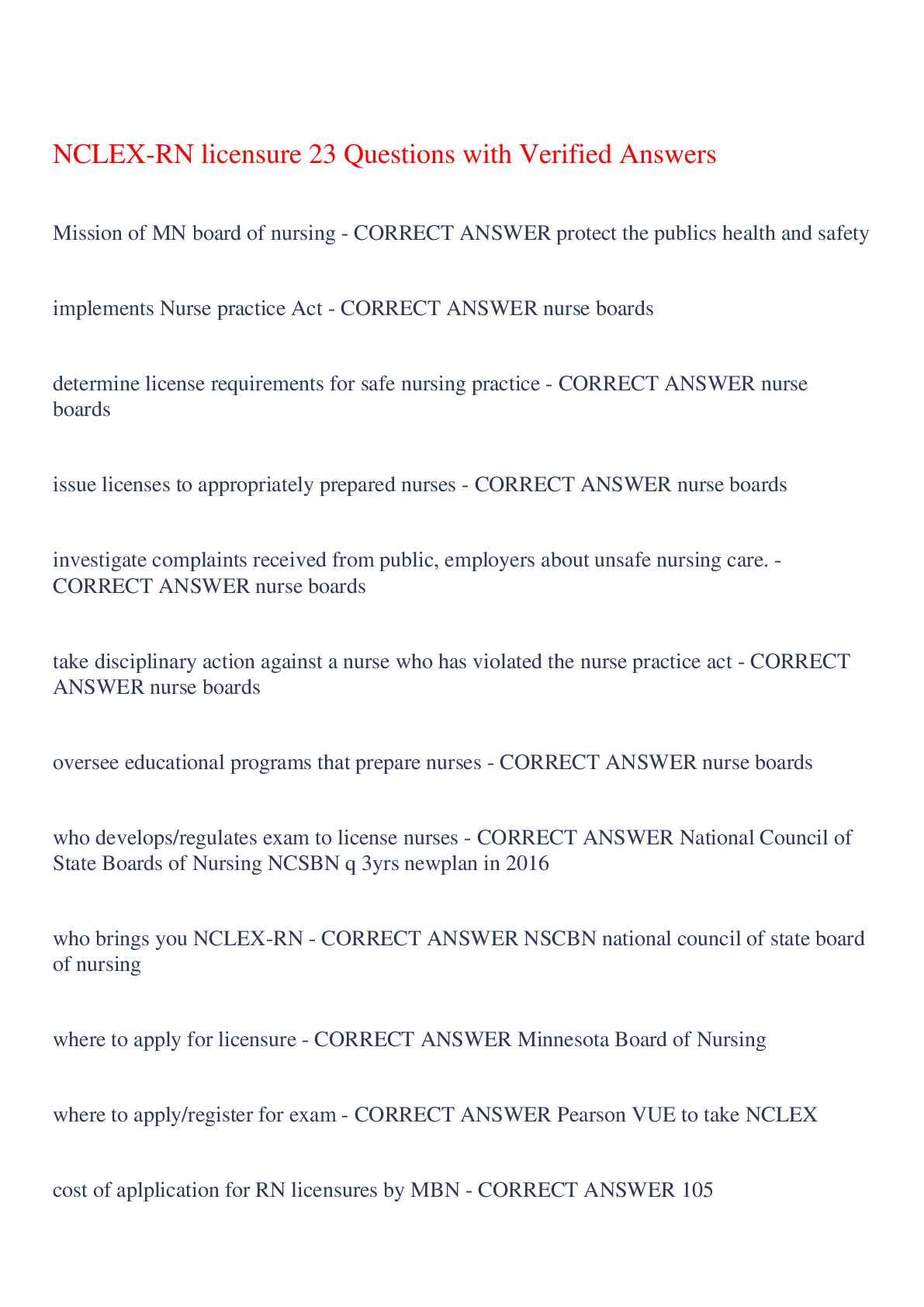 NCLEX RN > EXAM > NCLEX-RN licensure 23 Questions with Verified Answers,100% CORRECT (All)