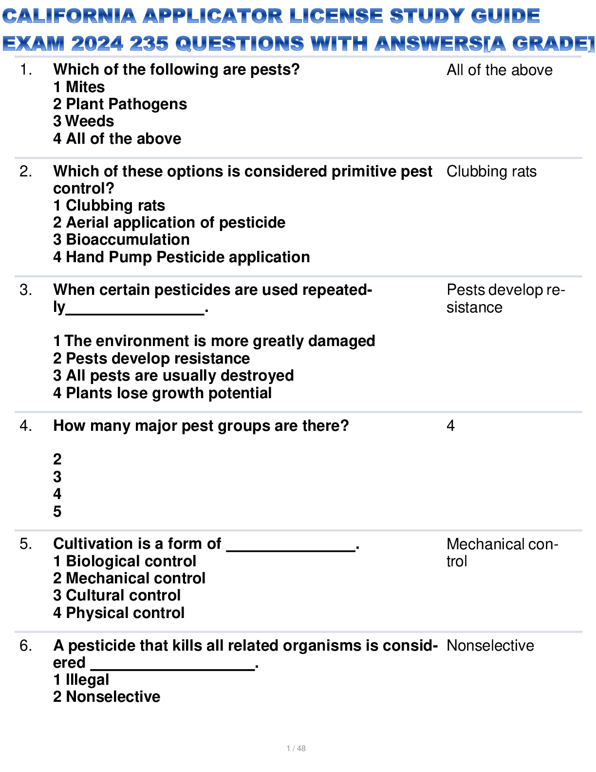 Pesticide License > STUDY GUIDE > CALIFORNIA APPLICATOR LICENSE STUDY GUIDE EXAM 2024 235 QUESTIONS WITH ANSWERS[A GRADE] (All)