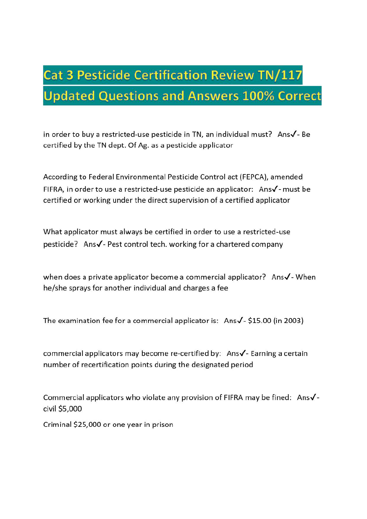 Pesticide License > EXAM > Cat 3 Pesticide Certification Review TN/117 Updated Questions and Answers 100% Correct (All)