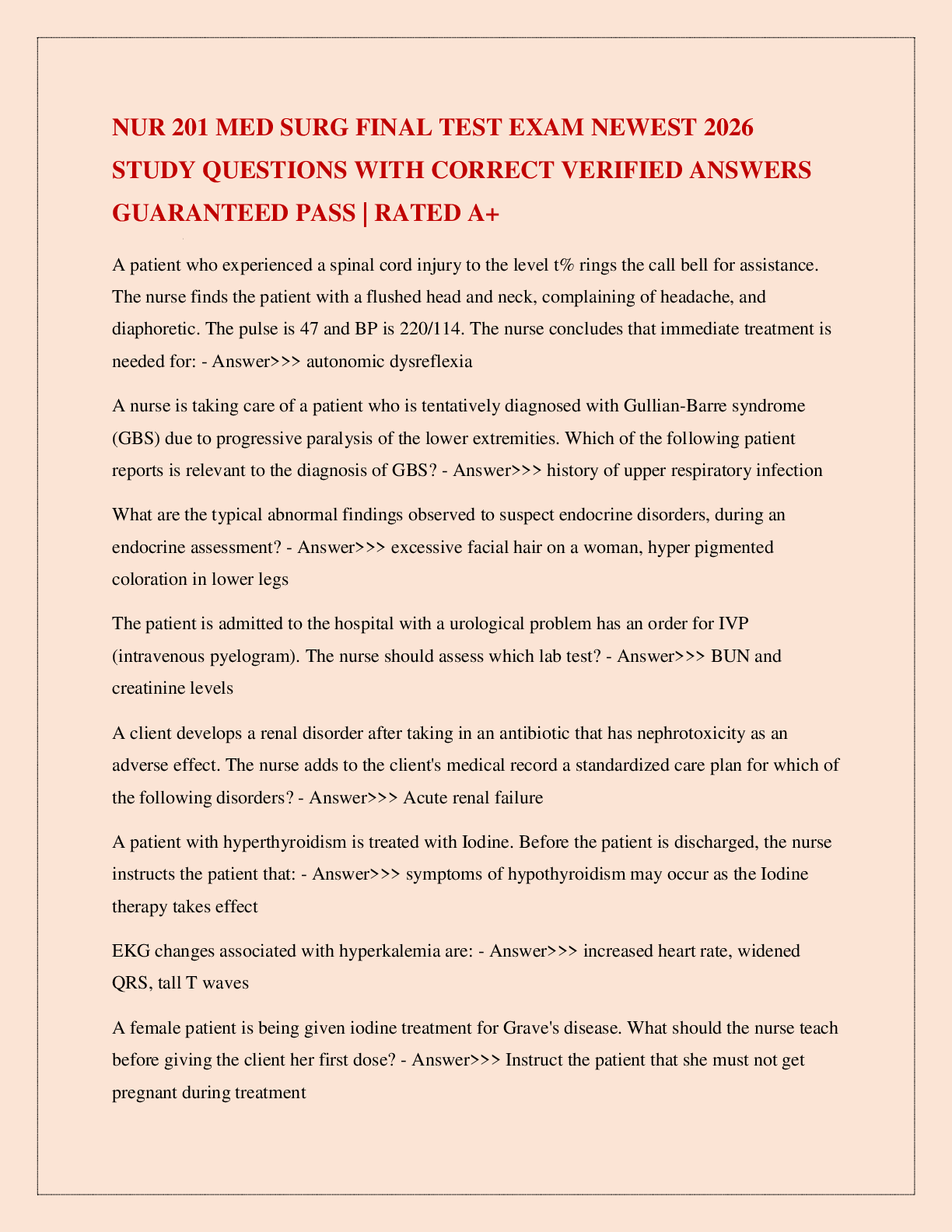 ATI Med Surg > EXAMs > NUR 201 MED SURG FINAL TEST EXAM NEWEST 2026 STUDY QUESTIONS WITH CORRECT VERIFIED ANSWERS GUARANTEED PASS | RATED A+ (All)