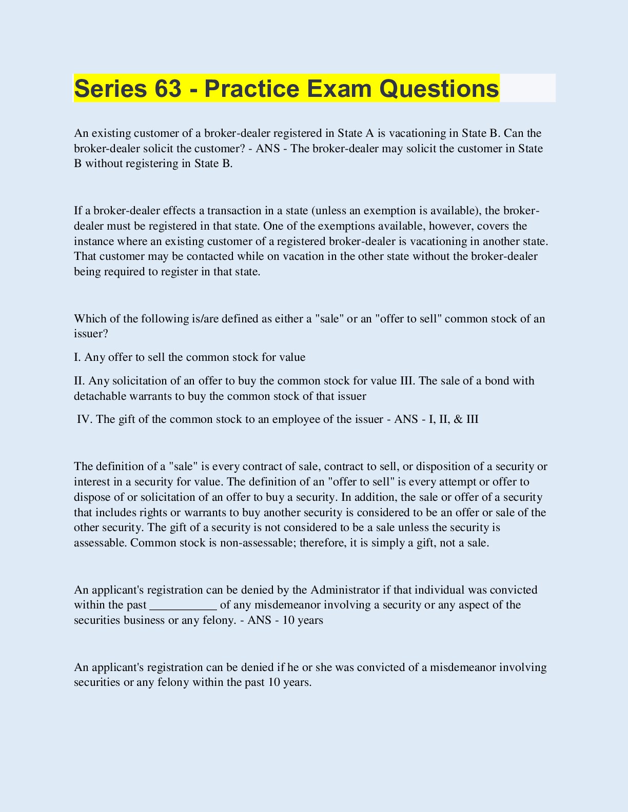 Marketing > QUESTIONS & ANSWERS > Series 63 - Practice Exam Questions (All)