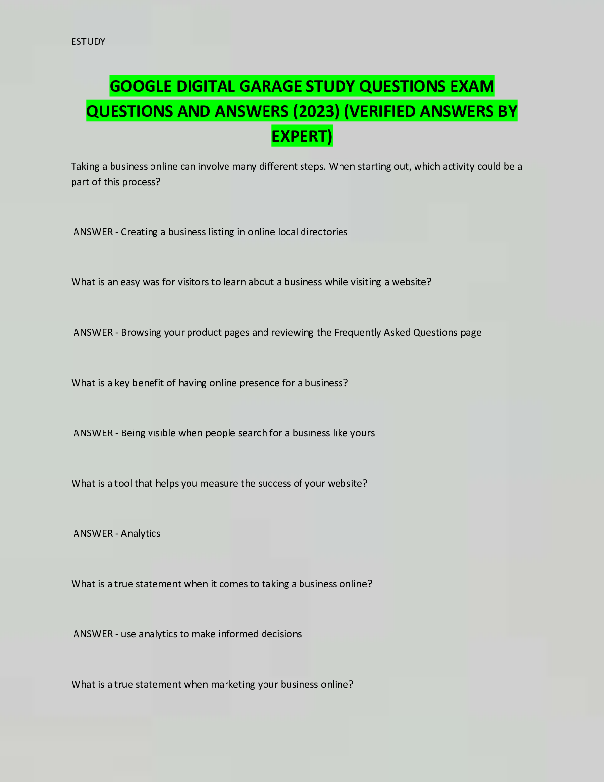 Marketing > EXAM > GOOGLE DIGITAL GARAGE STUDY QUESTIONS EXAM QUESTIONS AND ANSWERS (2023) (VERIFIED ANSWERS BY EXPERT) (All)