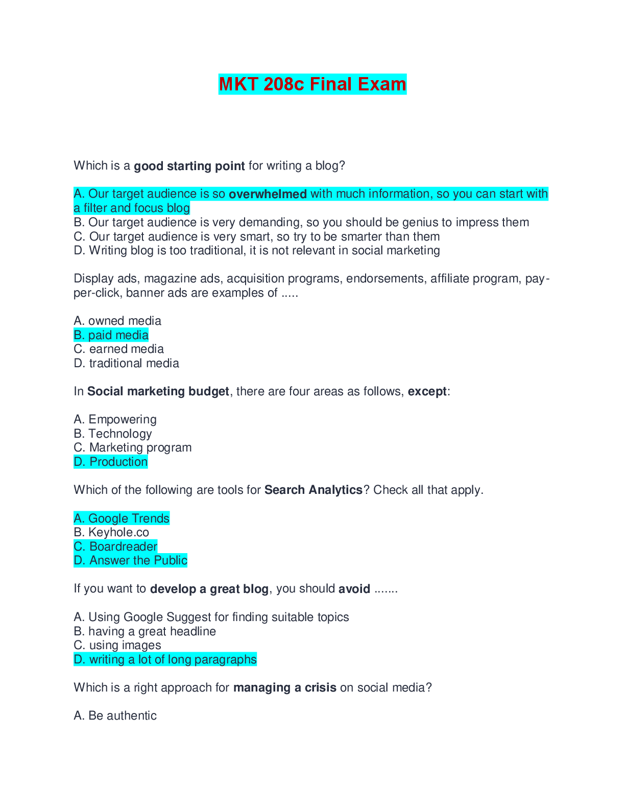 Marketing > EXAM > MKT 208c Final Exam | Complete Solutions (Verified) (All)