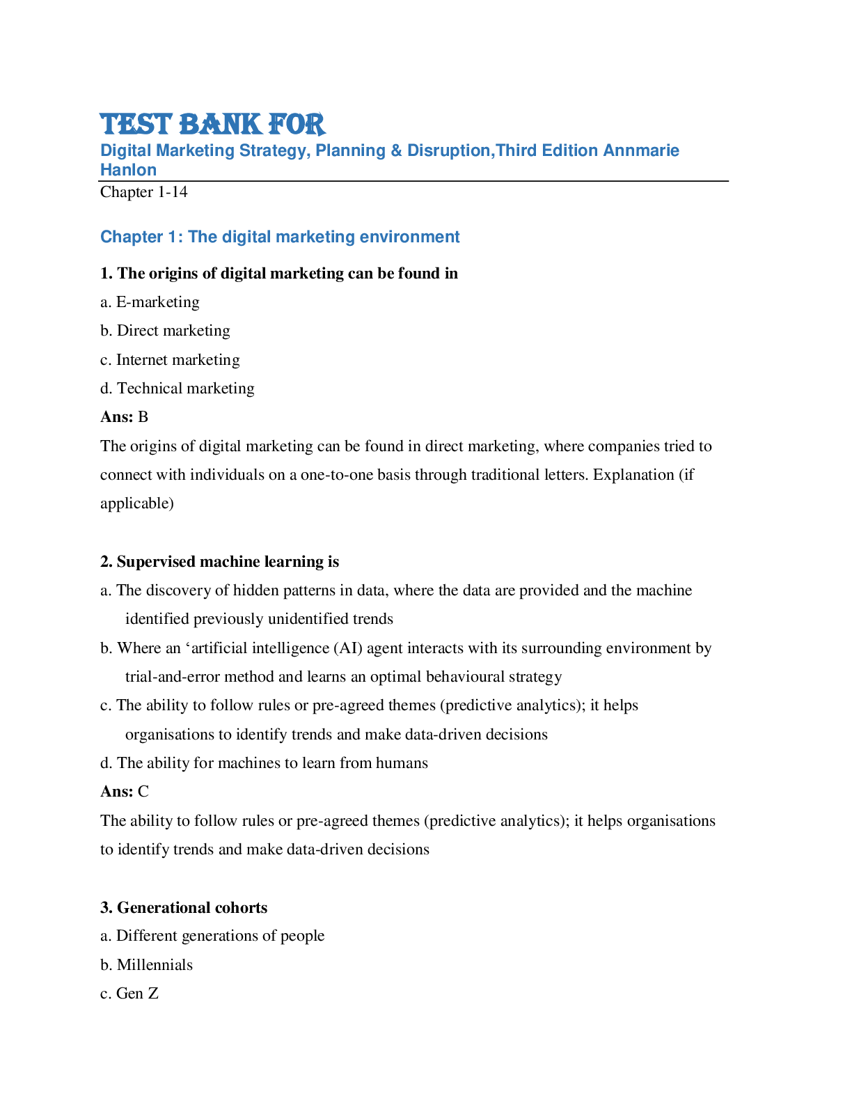 Marketing > TEST BANKS > Test Bank For Digital Marketing Strategy, Planning & Disruption,Third Edition By Annmarie Hanlon (All)