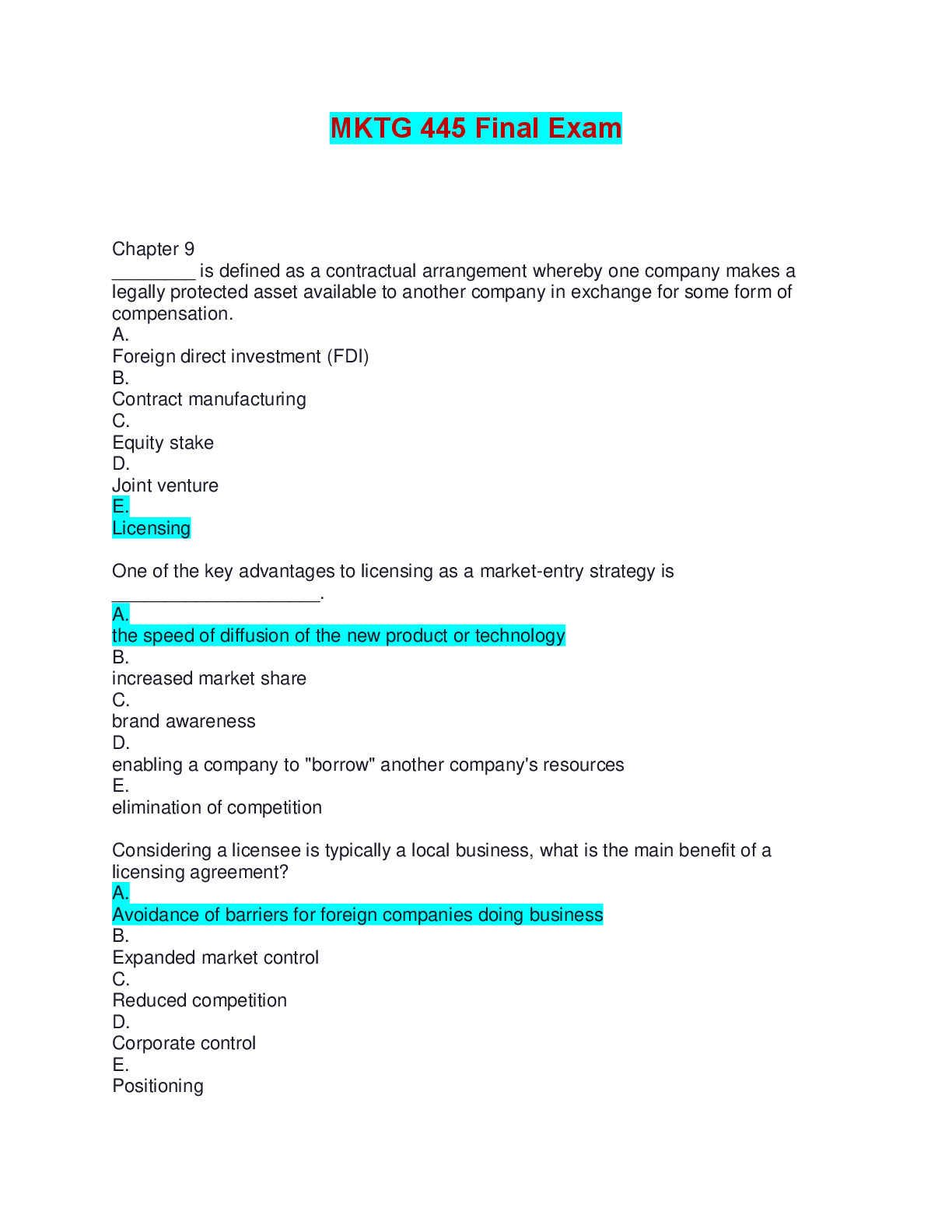 Marketing > EXAM > MKTG 445 Final Exam | Complete Solutions, Latest Version (All)