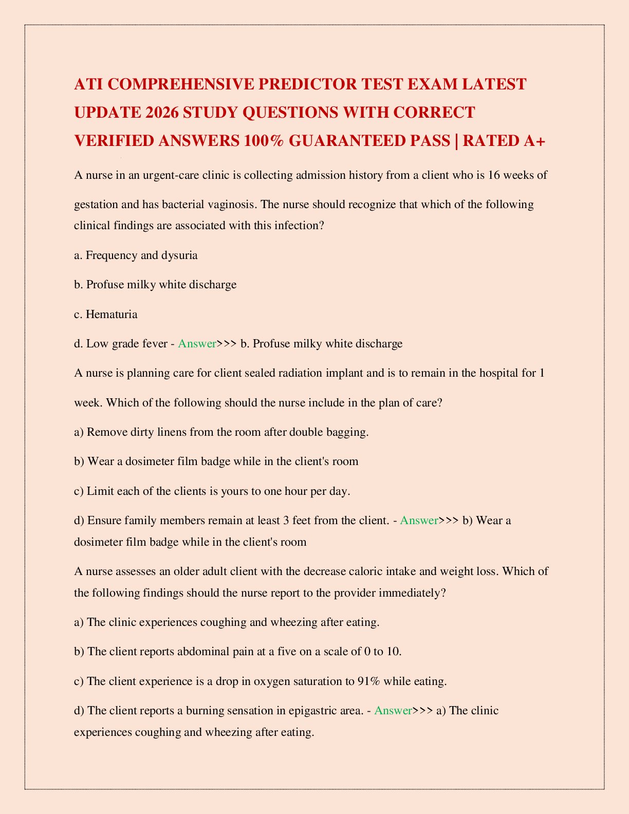 ATI COMPREHENSIVE PREDICTOR > EXAM > ATI COMPREHENSIVE PREDICTOR TEST EXAM LATEST UPDATE 2026 STUDY QUESTIONS WITH CORRECT VERIFIED ANSWERS 100% GUARANTEED PASS | RATED A+ (All)