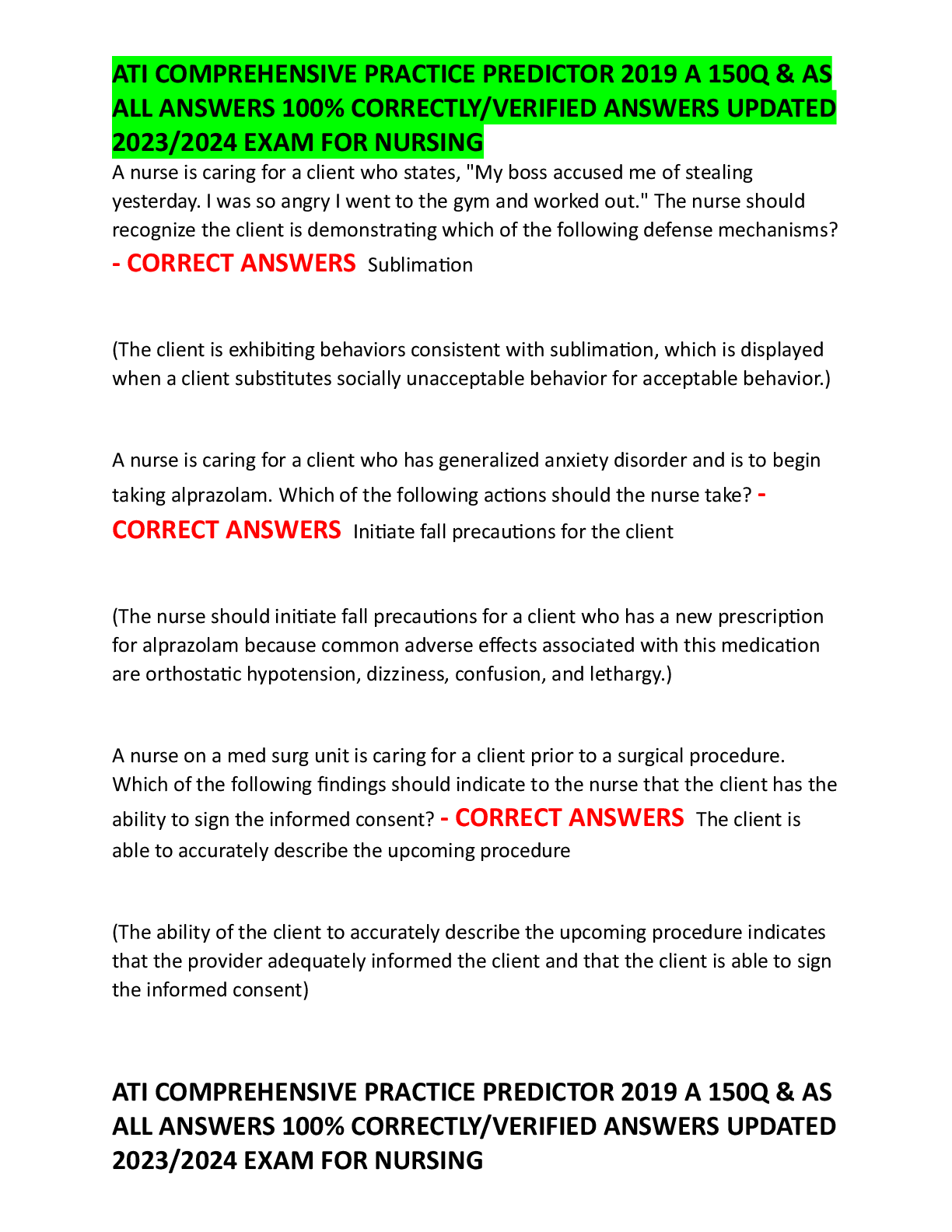 ATI COMPREHENSIVE PREDICTOR > EXAM > ATI COMPREHENSIVE PRACTICE PREDICTOR 2019 A 150Q & AS ALL ANSWERS 100 CORRECTLY-VERIFIED ANSWERS UPDATED 2025-2026 EXAM FOR NURSING (All)