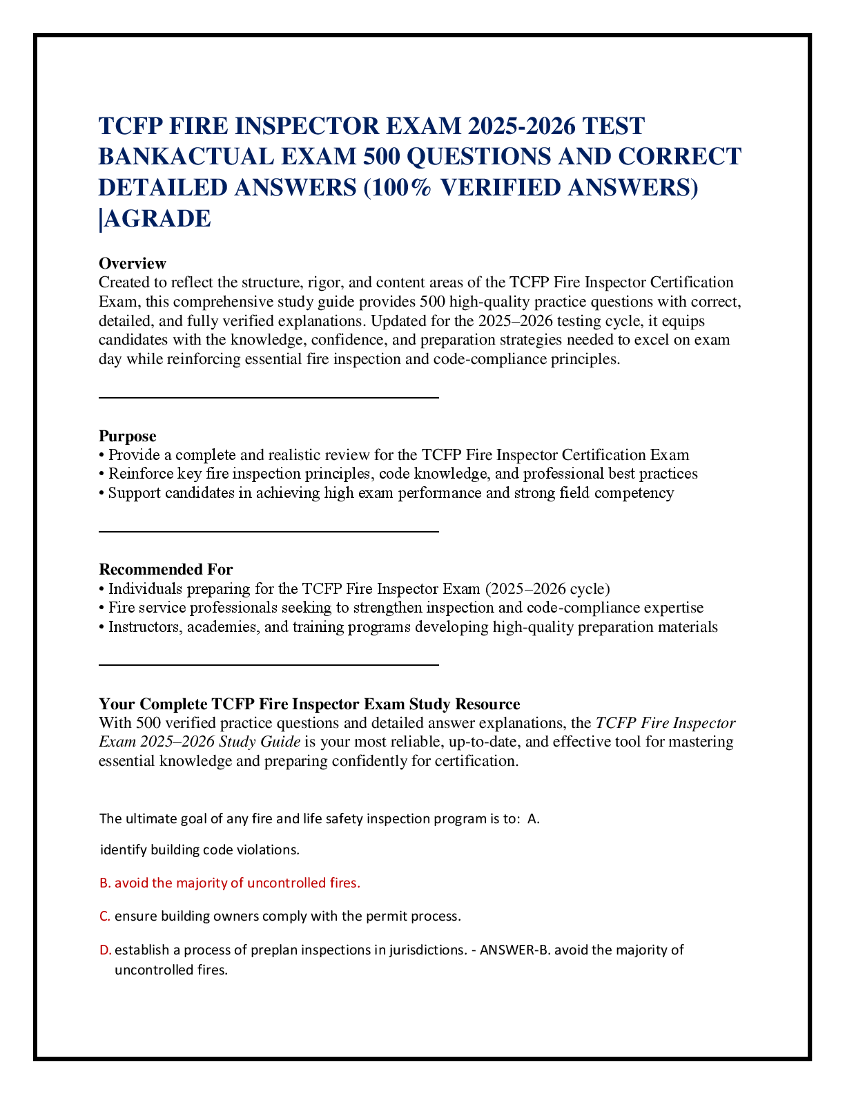 Fire Officer > EXAM > TCFP FIRE INSPECTOR EXAM 2025-2026 TEST BANKACTUAL EXAM 500 QUESTIONS AND CORRECT DETAILED ANSWERS (100% VERIFIED ANSWERS) |AGRADE (All)
