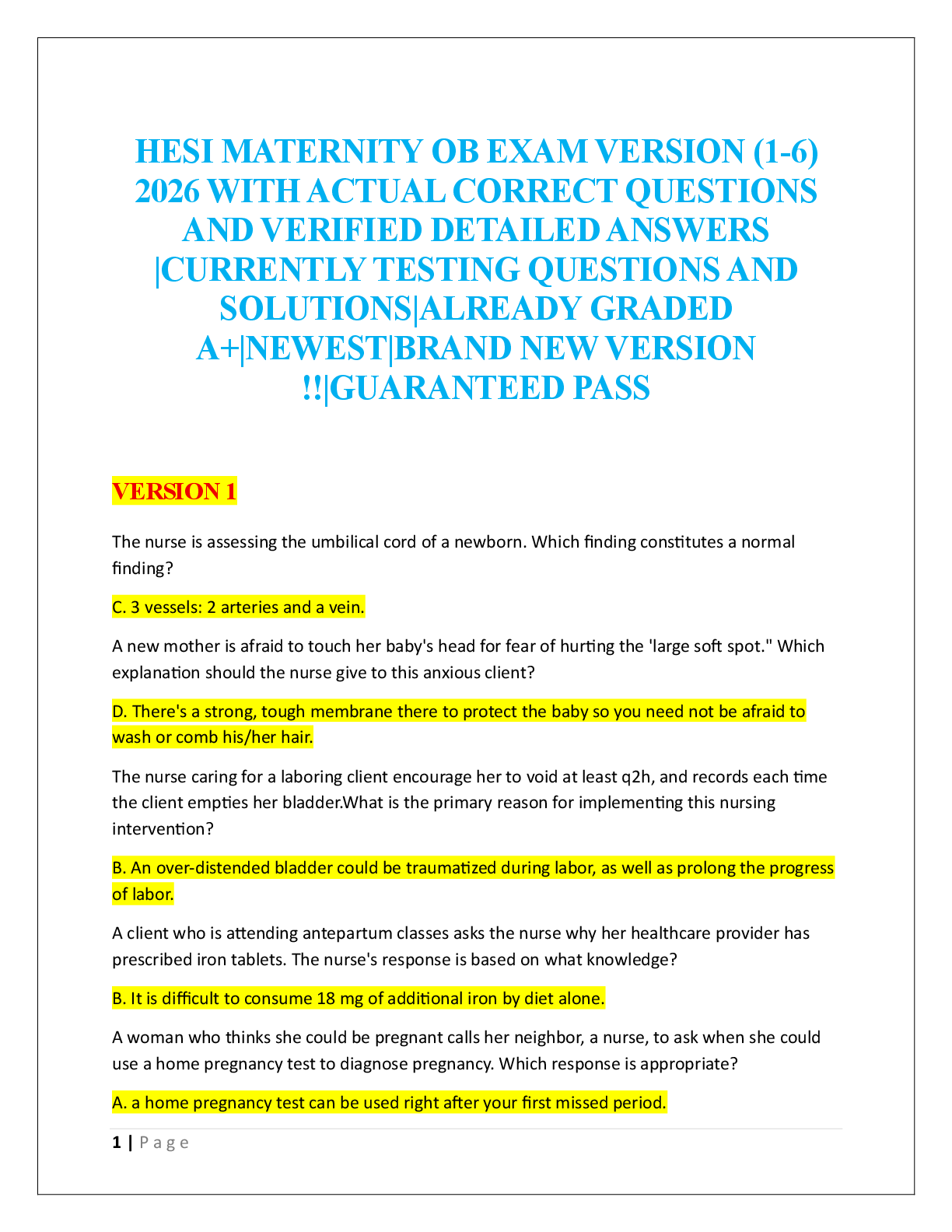 HESI OB Maternity > EXAMs > HESI MATERNITY OB EXAM VERSION (1-6) 2026 (All)