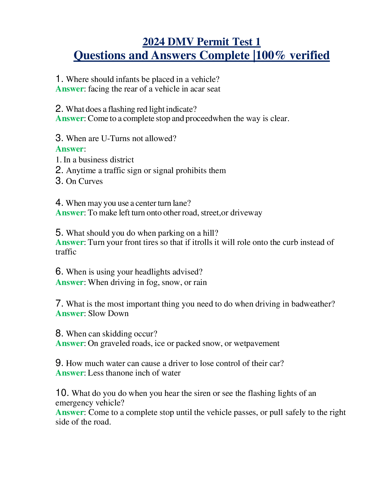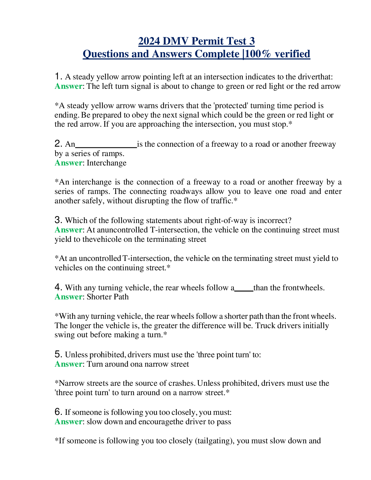 NJ DMV > EXAMs > 2024 DMV Permit Test 1 Questions and Answers Complete |100% verified (All)