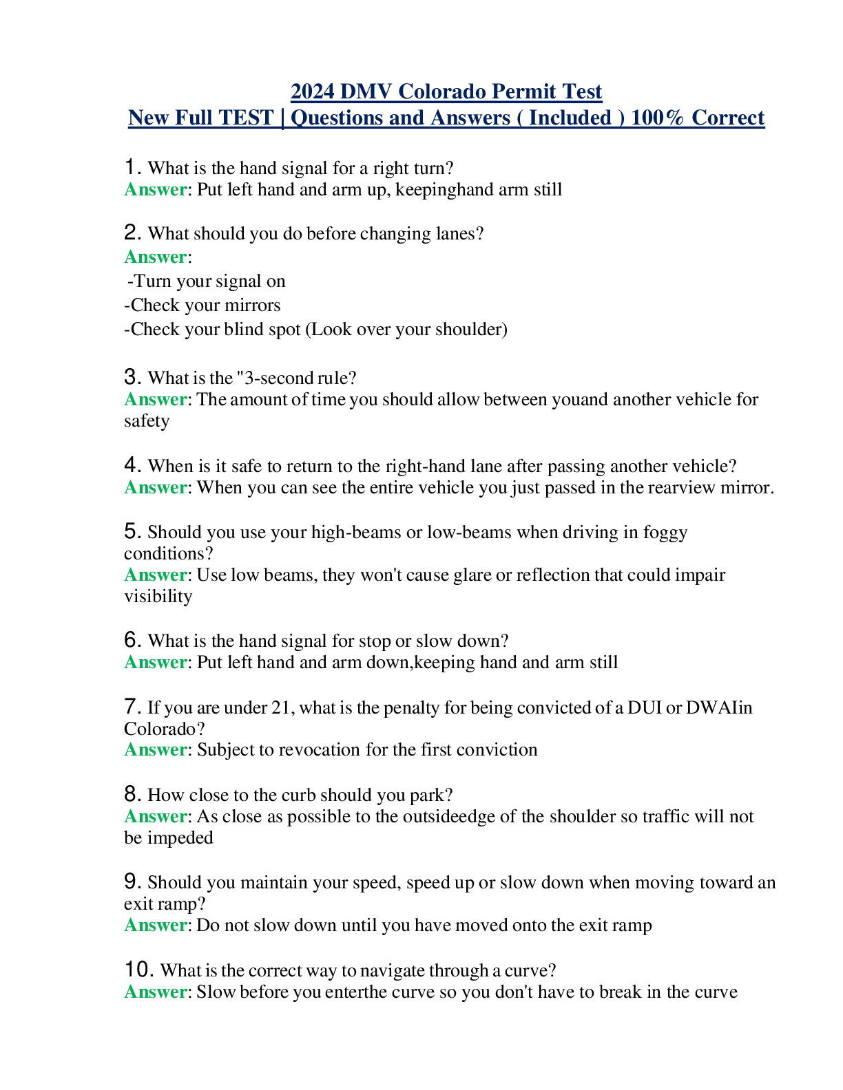 NJ DMV > EXAMs > 2024 DMV Colorado Permit Test New Full TEST | Questions and Answers ( Included ) 100% Correct (All)