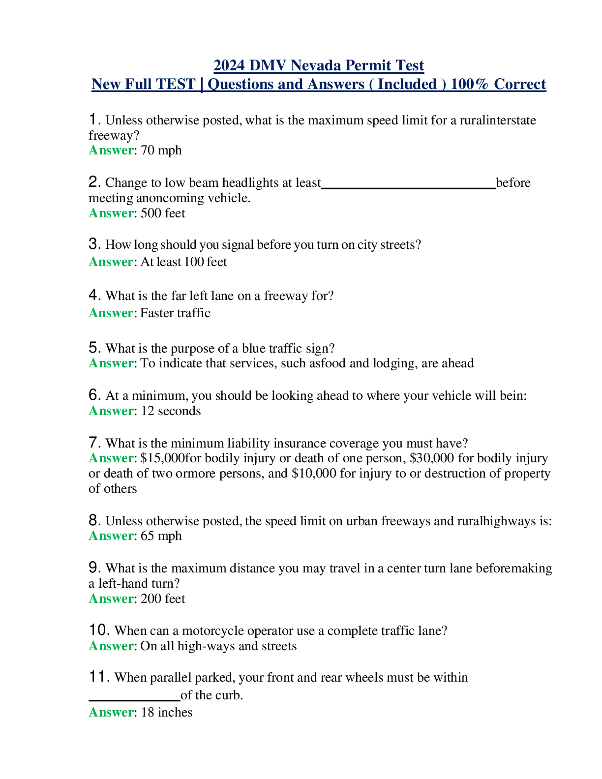 NJ DMV > EXAMs > 2024 DMV Nevada Permit Test New Full TEST | Questions and Answers ( Included ) 100% Correct (All)