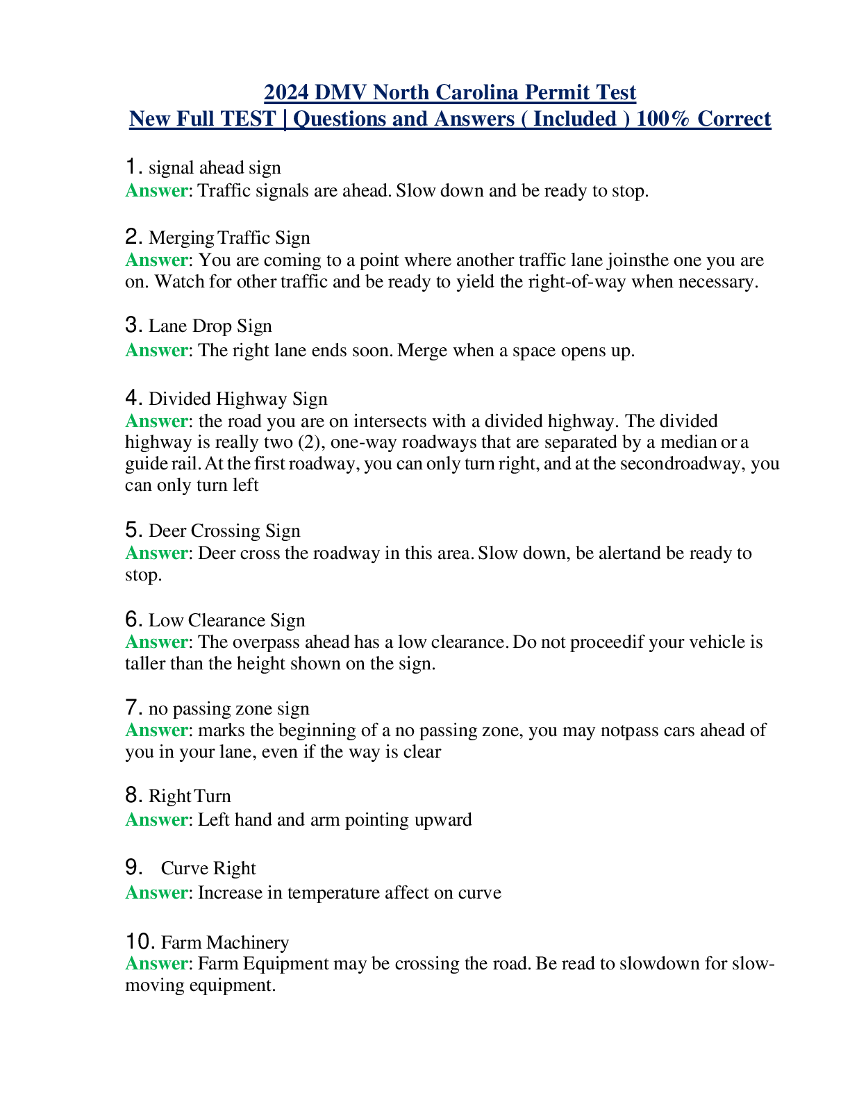NJ DMV > EXAMs > 2024 DMV North Carolina Permit Test New Full TEST | Questions and Answers ( Included ) 100% Correct (All)