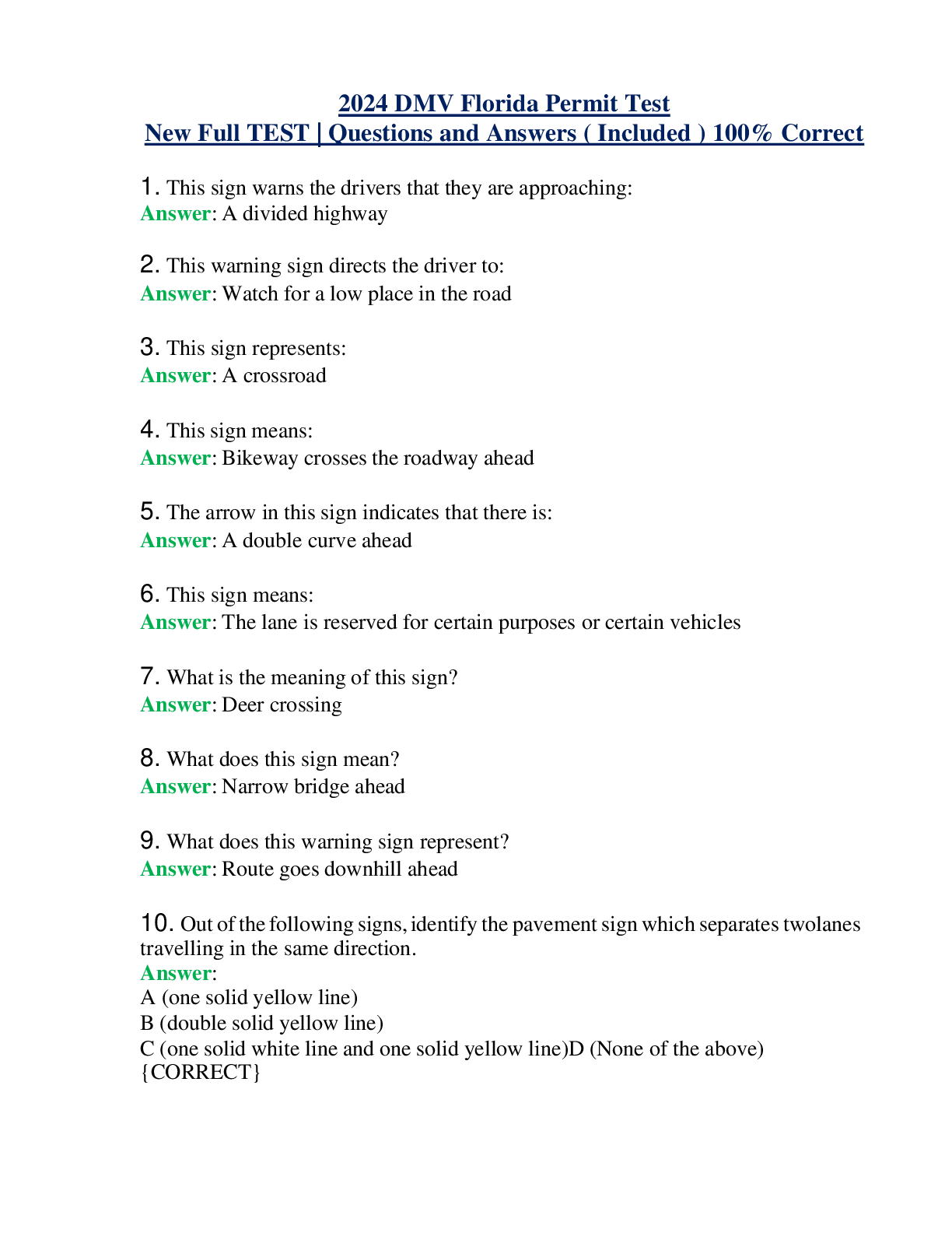 NJ DMV > EXAMs > 2024 DMV Florida Permit Test New Full TEST | Questions and Answers ( Included ) 100% Correct (All)