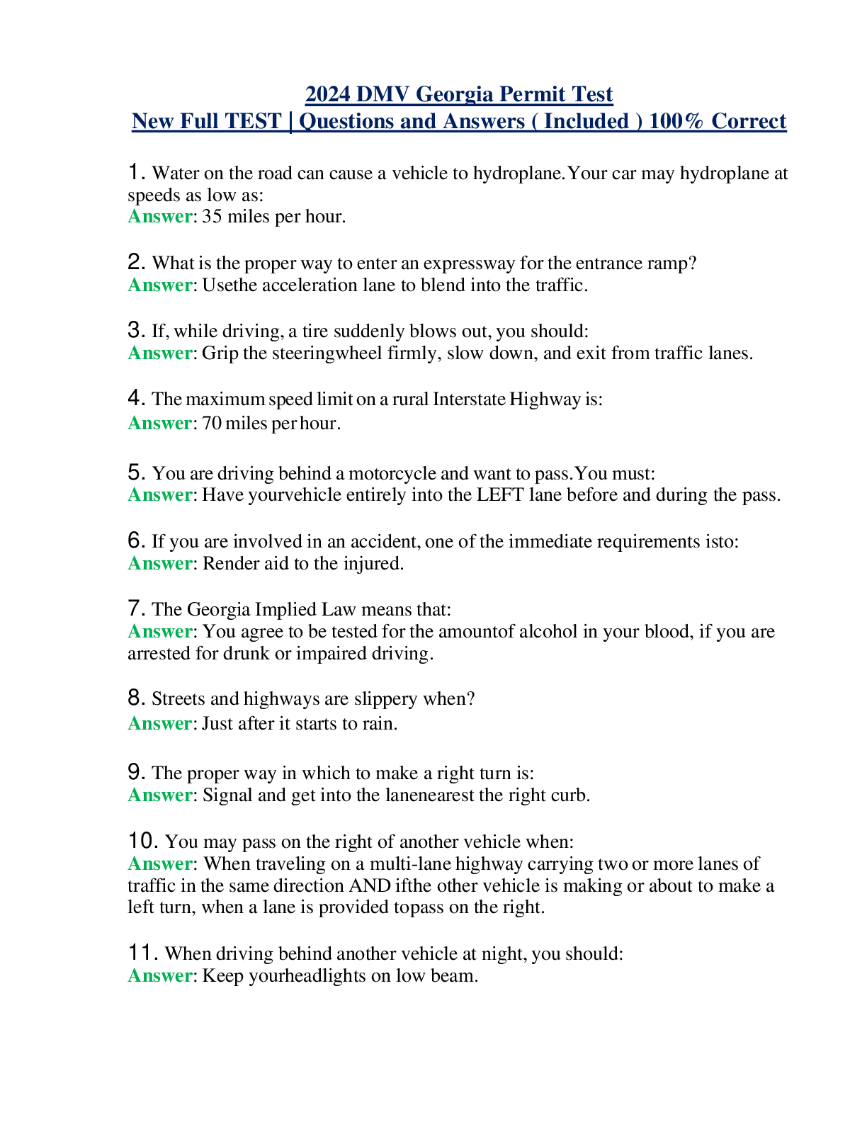 NJ DMV > EXAMs > 2024 DMV Georgia Permit Test New Full TEST | Questions and Answers ( Included ) 100% Correct (All)