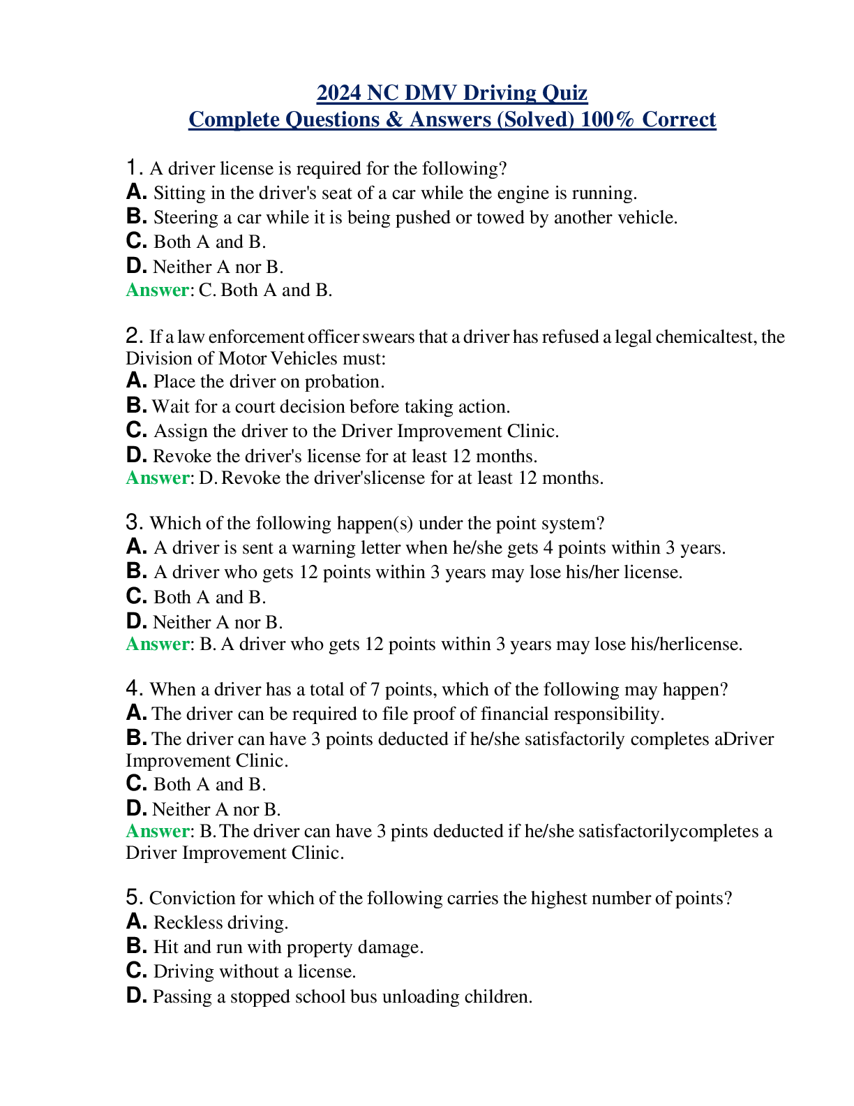 NJ DMV > EXAMs > 2024 NC DMV Driving Quiz Complete Questions & Answers (Solved) 100% Correct (All)
