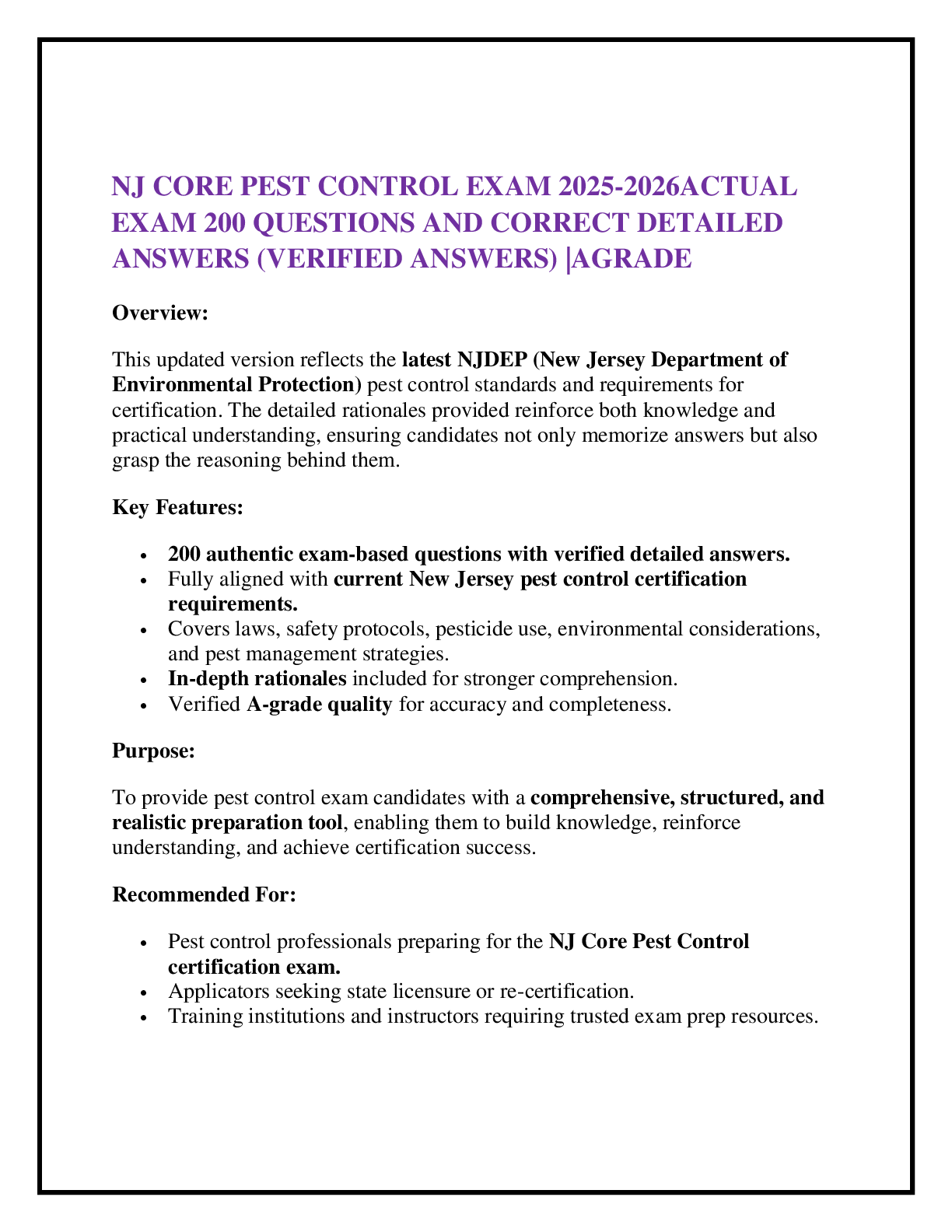 NJ PESTCIDE CORE > EXAM > Nc Pesticide Applicator Core Manual – Practice Exam Questions And Revised Correct Answers With Rationales |Guaranteed Pass (All)