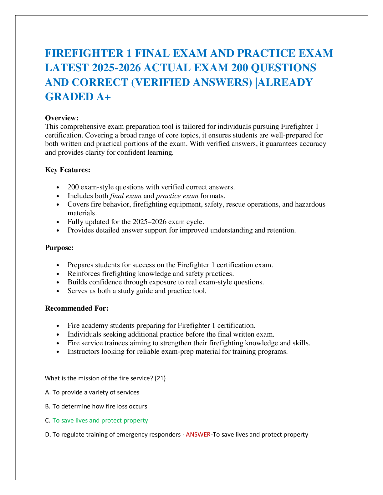 Firefighter 1 & 2 > EXAM > FIREFIGHTER 1 FINAL EXAM AND PRACTICE EXAM LATEST 2025-2026 ACTUAL EXAM 200 QUESTIONS AND CORRECT (VERIFIED ANSWERS) |ALREADY GRADED A+ (All)