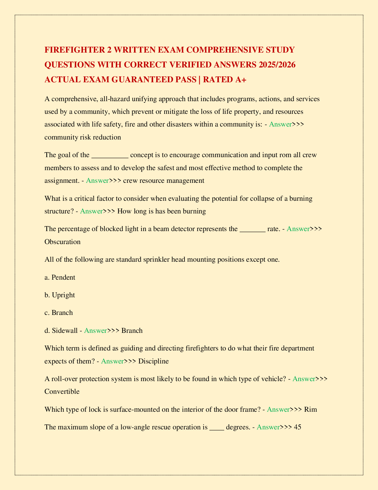 Firefighter 1 & 2 > EXAM > FIREFIGHTER 2 WRITTEN EXAM COMPREHENSIVE STUDY QUESTIONS WITH CORRECT VERIFIED ANSWERS 2025/2026 ACTUAL EXAM GUARANTEED PASS | RATED A+ (All)