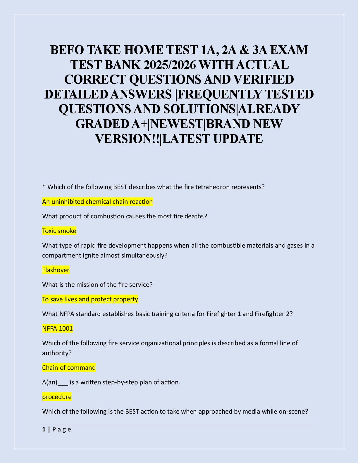 Firefighter 1 & 2 > EXAM > BEFO TAKE HOME TEST 1A, 2A & 3A EXAM TEST BANK 2025/2026 (All)