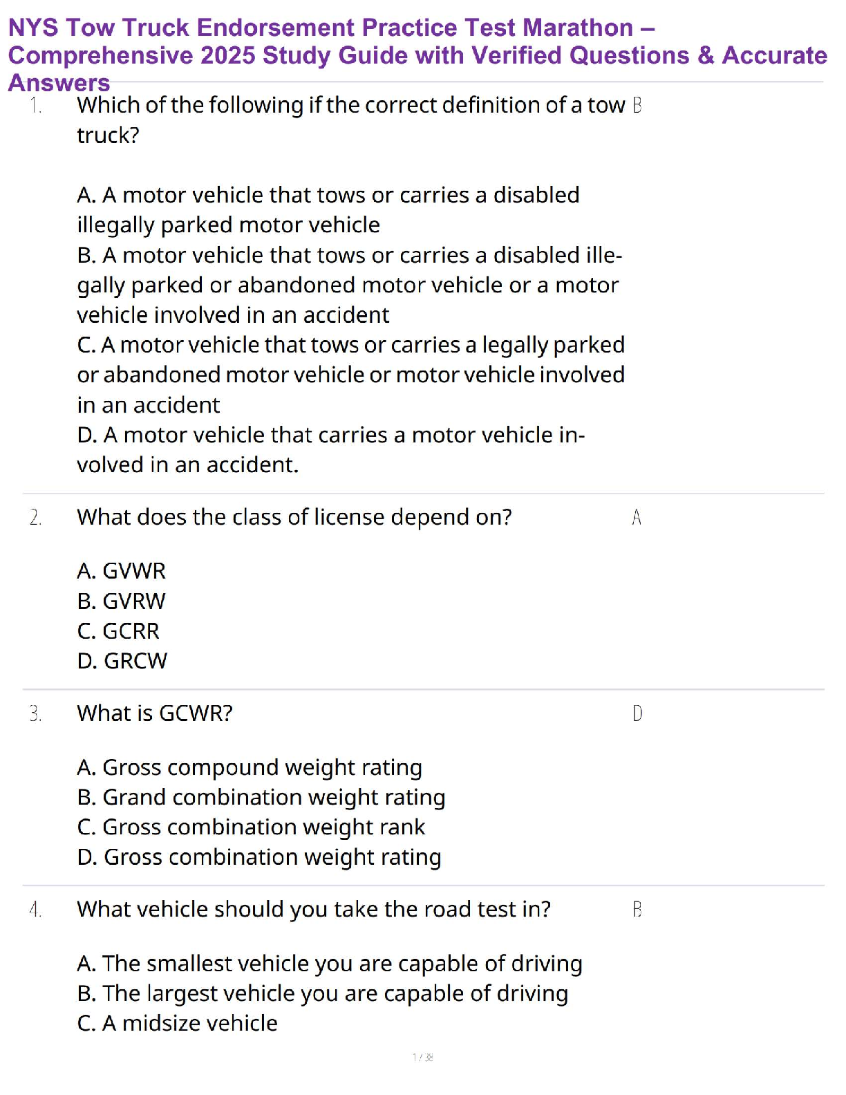 Firefighter 1 & 2 > STUDY GUIDE > NYS Tow Truck Endorsement Practice Test Marathon – Comprehensive 2025 Study Guide with Verified Questions & Accurate Answers (All)