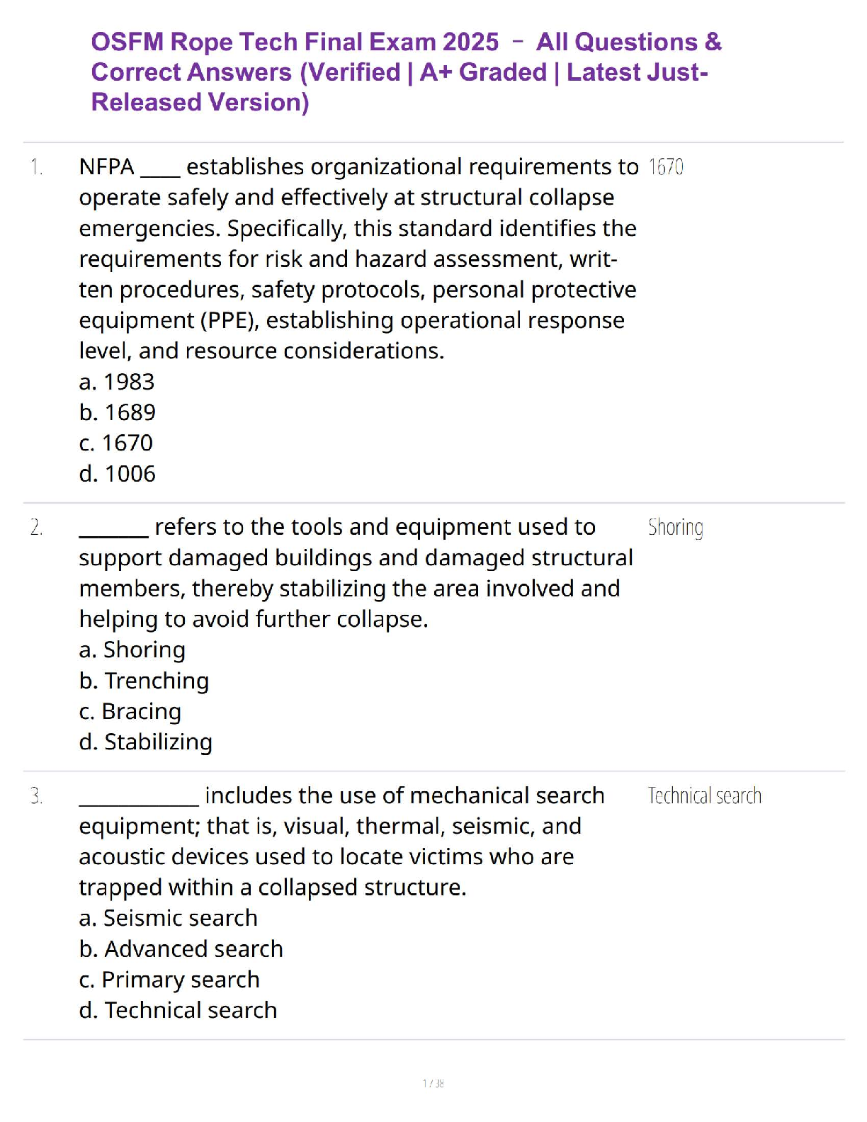 Firefighter 1 & 2 > EXAM > OSFM Rope Tech Final Exam 2025 – All Questions & Correct Answers (Verified | A+ Graded | Latest Just-Released Version) (All)