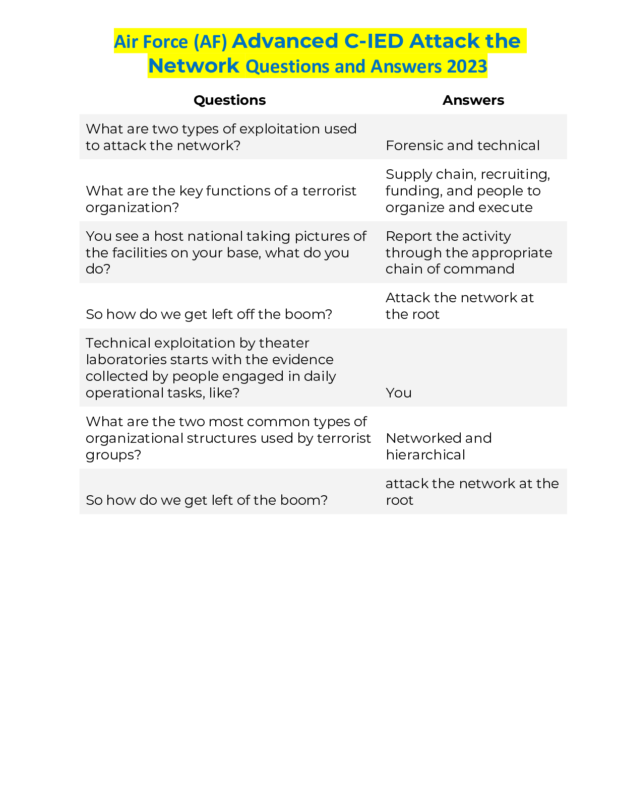 Computer Networking > EXAM > Air Force (AF) Advanced C-IED Attack the Network Questions and Answers 2023 (All)