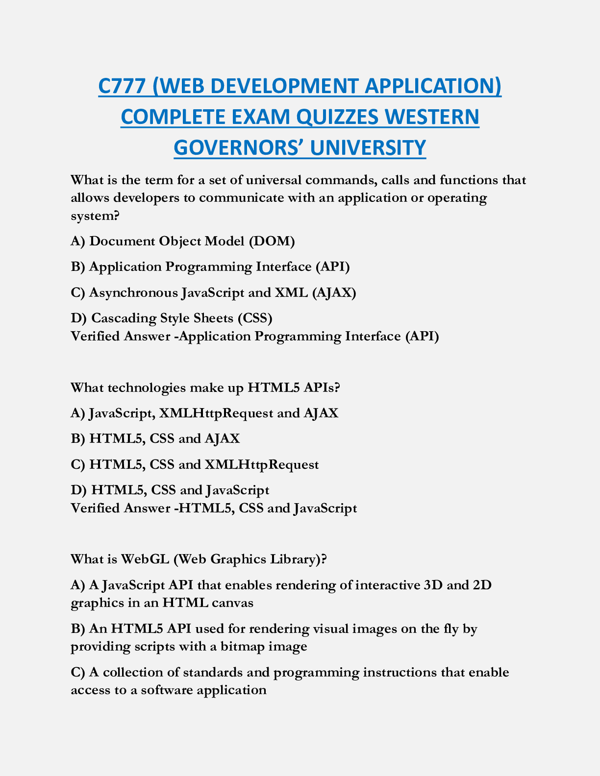 Computer Networking > EXAM > C777 (WEB DEVELOPMENT APPLICATION) COMPLETE EXAM QUIZZES WESTERN GOVERNORS’ UNIVERSITY (All)