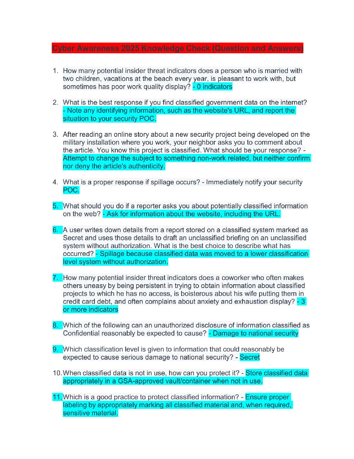 Computer Networking > QUESTIONS & ANSWERS > Cyber Awareness 2025 Knowledge Check: Comprehensive Questions and Answers (All)