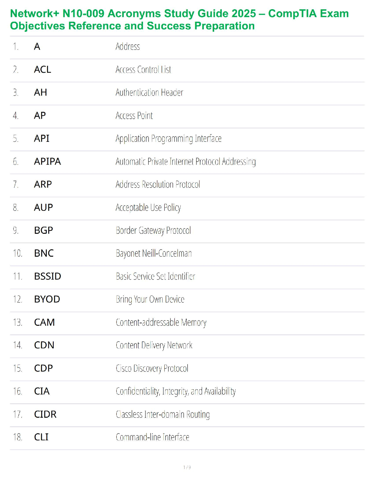 Computer Networking > STUDY GUIDE > Network+ N10-009 Acronyms Study Guide 2025 – CompTIA Exam Objectives Reference and Success Preparation (All)