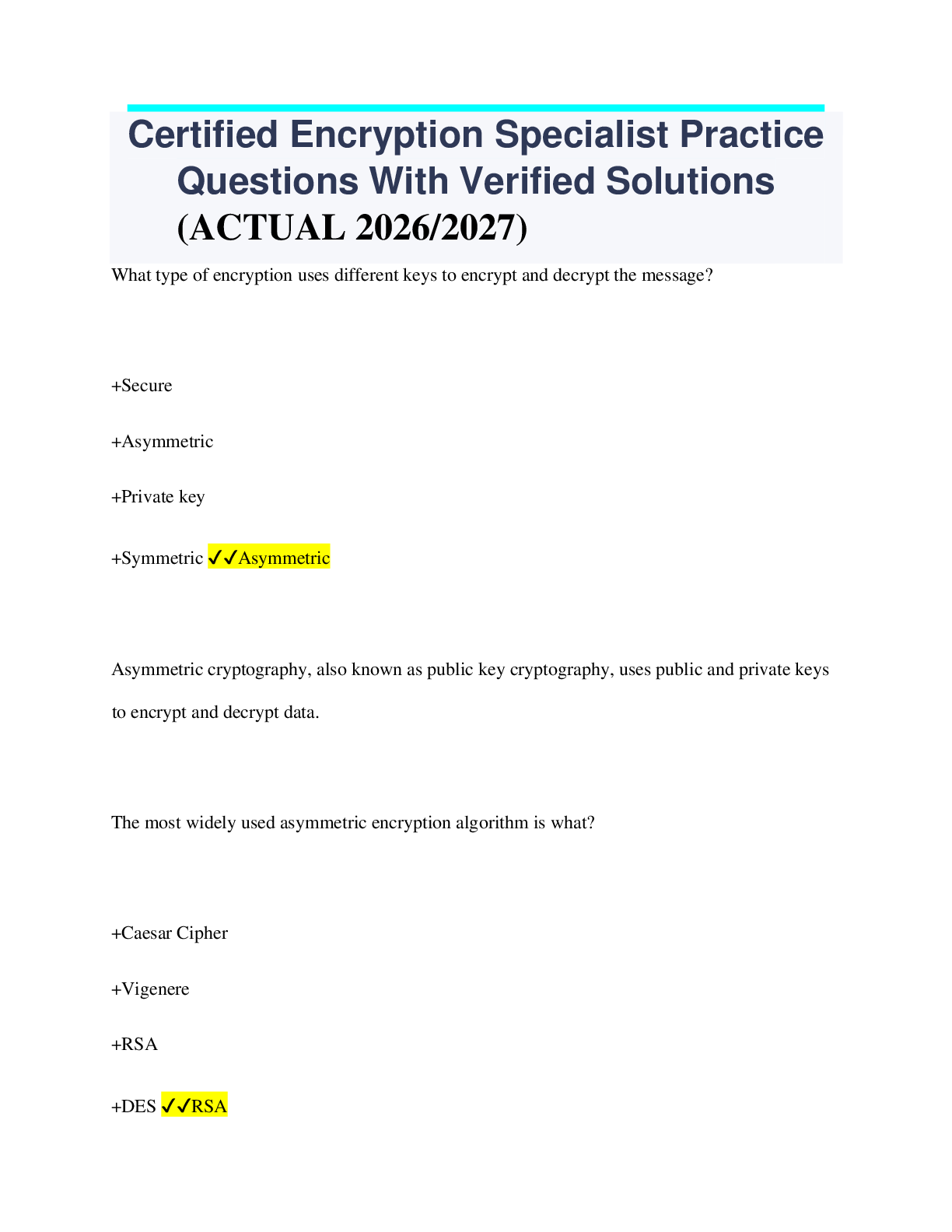 Computer Networking > QUESTIONS & ANSWERS > Certified Encryption Specialist Practice Questions With Verified Solutions (ACTUAL 2026/2027) (All)