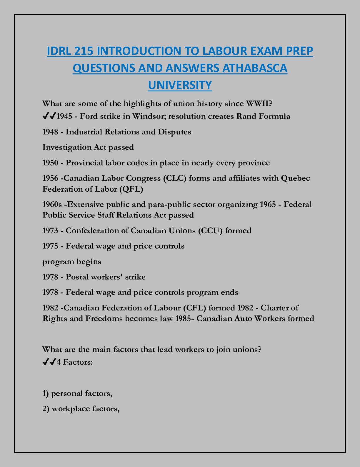 Data Networks > EXAM > IDRL 215 INTRODUCTION TO LABOUR EXAM PREP QUESTIONS AND ANSWERS ATHABASCA UNIVERSITY (All)