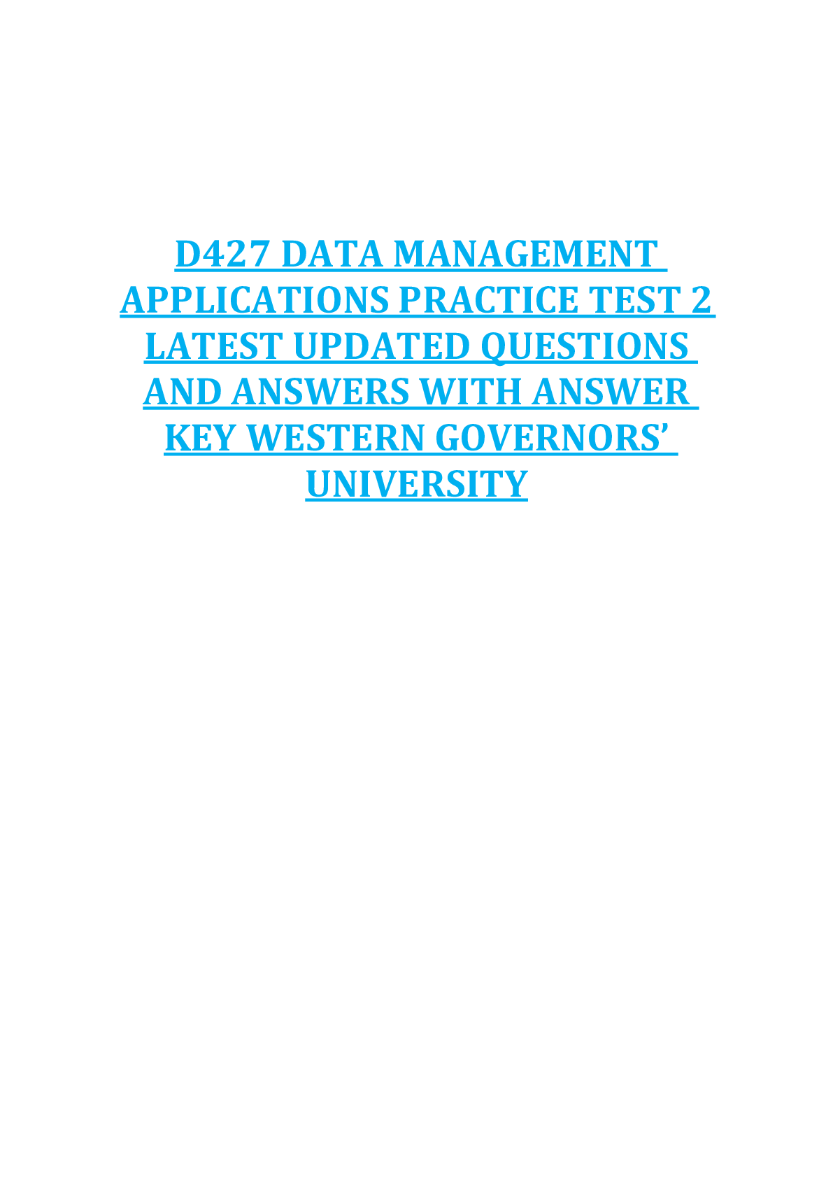 Data Networks > EXAM > D427 DATA MANAGEMENT APPLICATIONS PRACTICE TEST 2 LATEST UPDATED QUESTIONS AND ANSWERS WITH ANSWER KEY WESTERN GOVERNORS’ UNIVERSITY (All)
