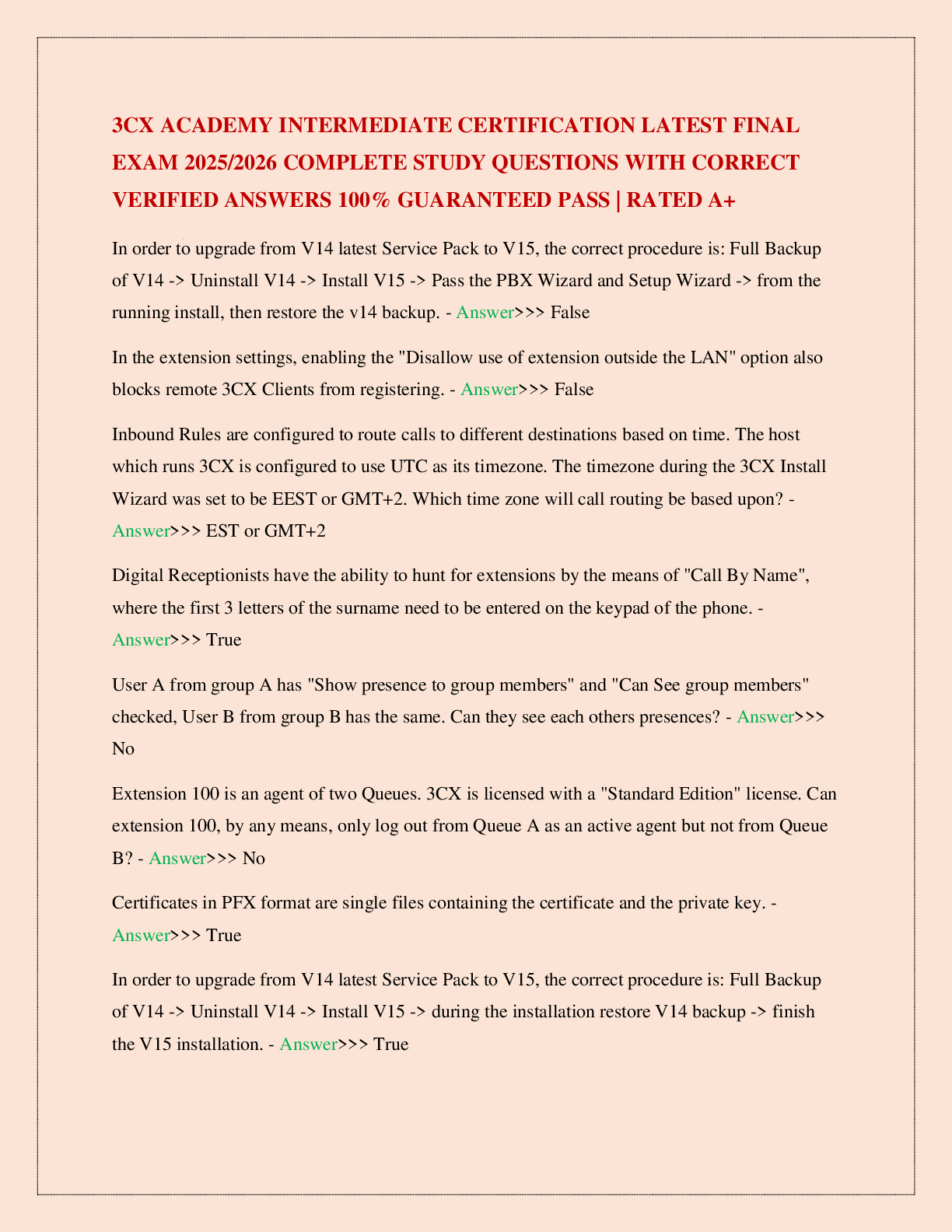 Programming > EXAM > 3CX ACADEMY INTERMEDIATE CERTIFICATION LATEST FINAL EXAM 2025/2026 COMPLETE STUDY QUESTIONS WITH CORRECT VERIFIED ANSWERS 100% GUARANTEED PASS | RATED A+ (All)