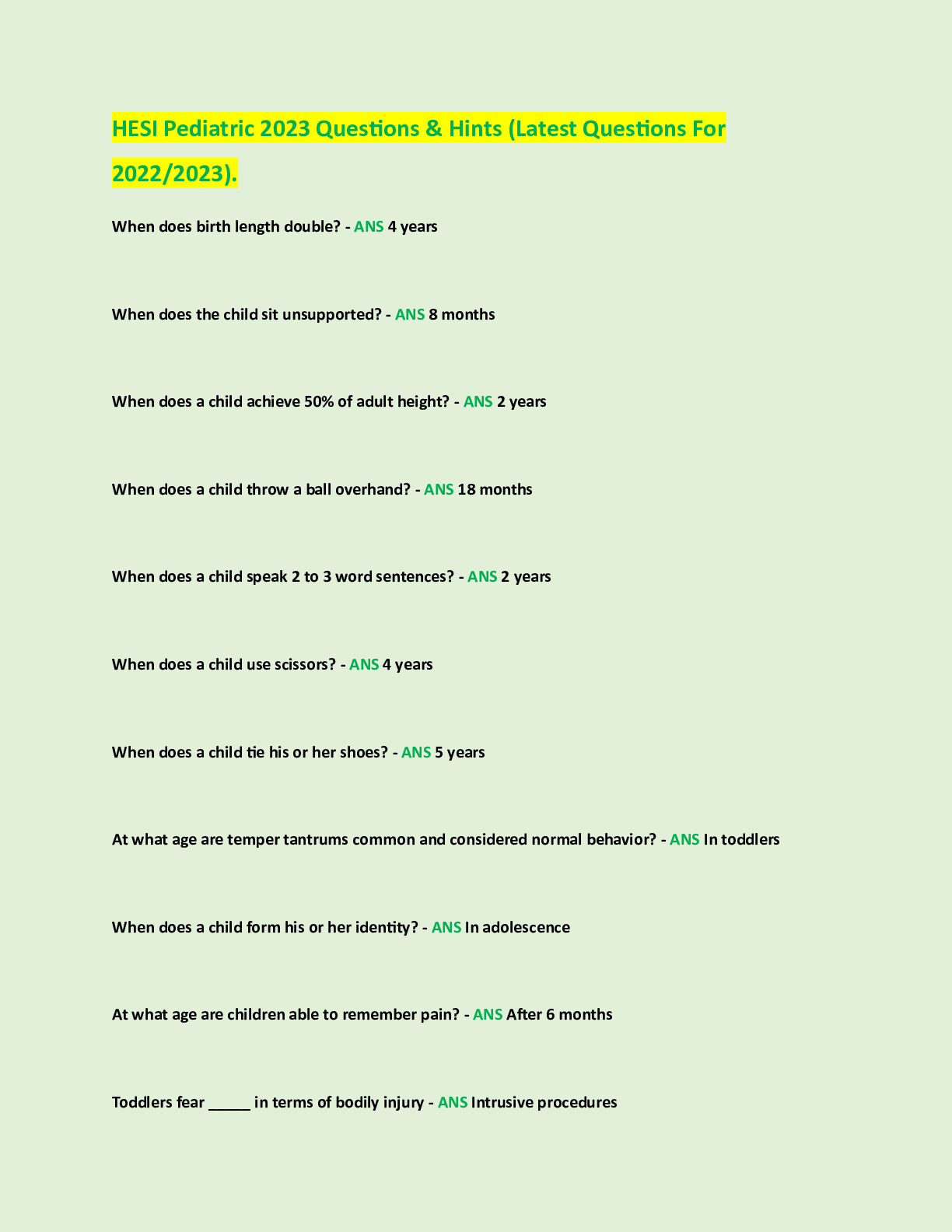 Hesi Pediatrics Peds > QUESTIONS & ANSWERS > HESI Pediatric 2023 Questions & Hints (Latest Questions For 2022/2023). (All)