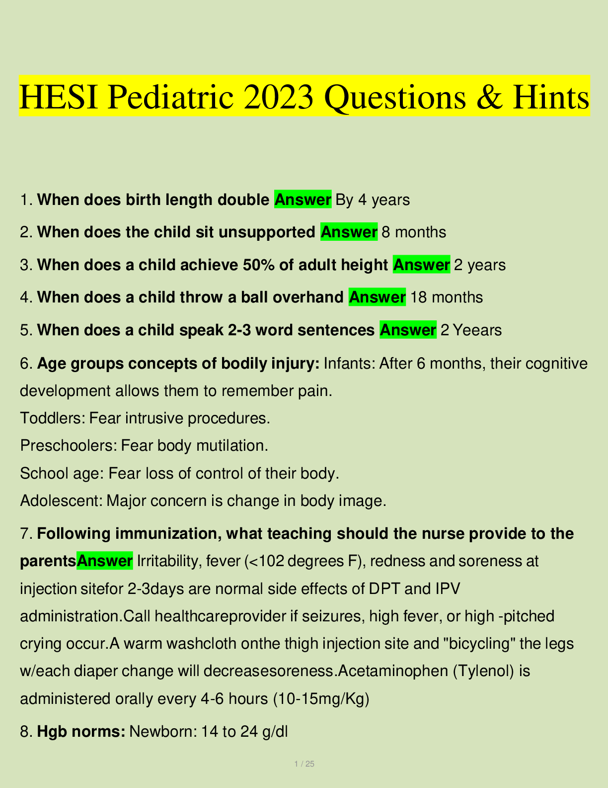 Hesi Pediatrics Peds > QUESTIONS & ANSWERS > HESI Pediatric 2023 Questions & Hints (All)