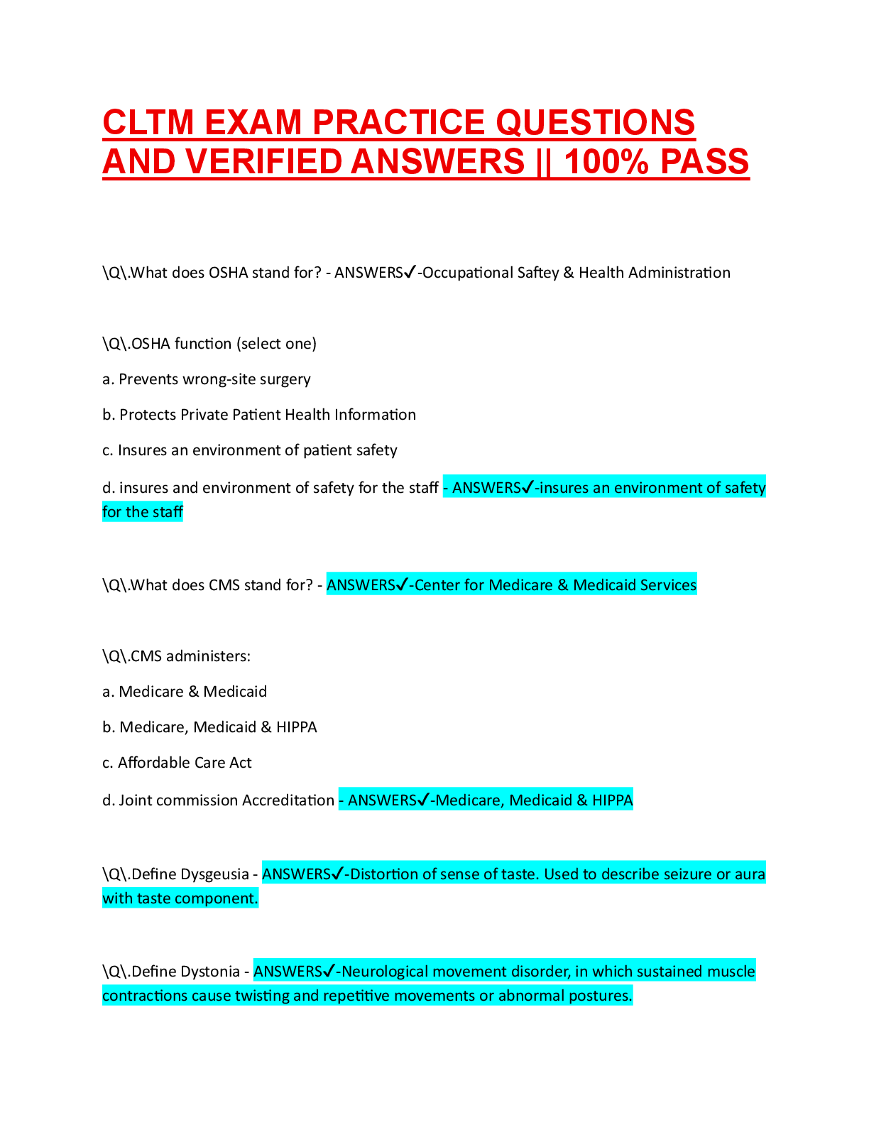 Clinical Medicine > A-Level Mark Scheme > CLTM EXAM PRACTICE QUESTIONS AND VERIFIED ANSWERS || 100% PASS (All)