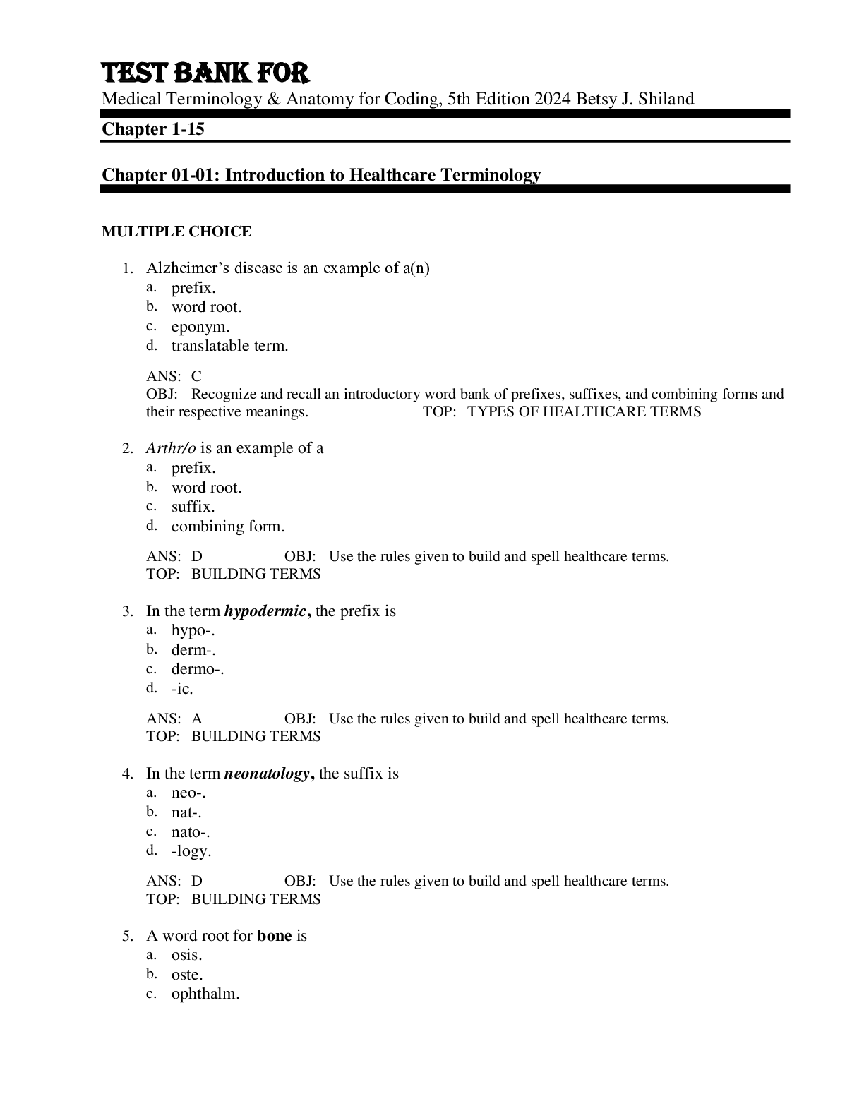 Clinical Medicine > TEST BANKS > Test Bank For Medical Terminology & Anatomy for Coding, 5th Edition by 2024 Betsy J. Shiland Chapter 1-15 (All)