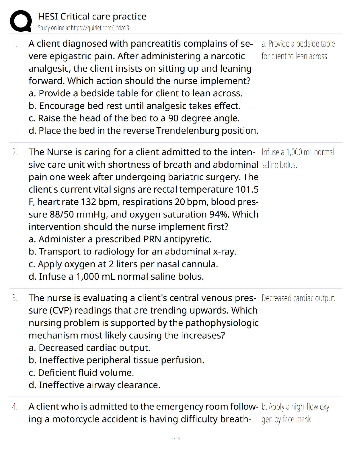 HESI Med Surg > QUESTIONS & ANSWERS > HESI Critical Care Practice / Test Bank / Study Guide 2025 Update – Score 100% (All)
