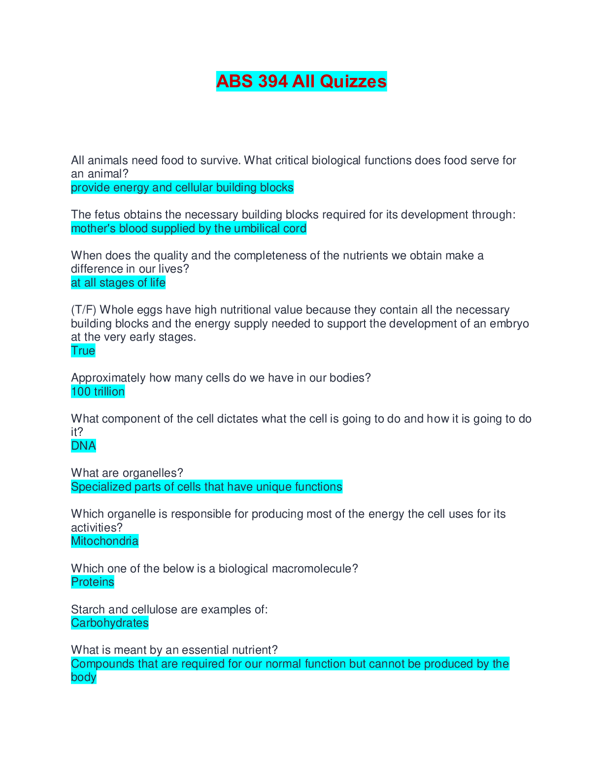 Animal Physiology > EXAM > ABS 394 All Quizzes | Questions and Answers (All)
