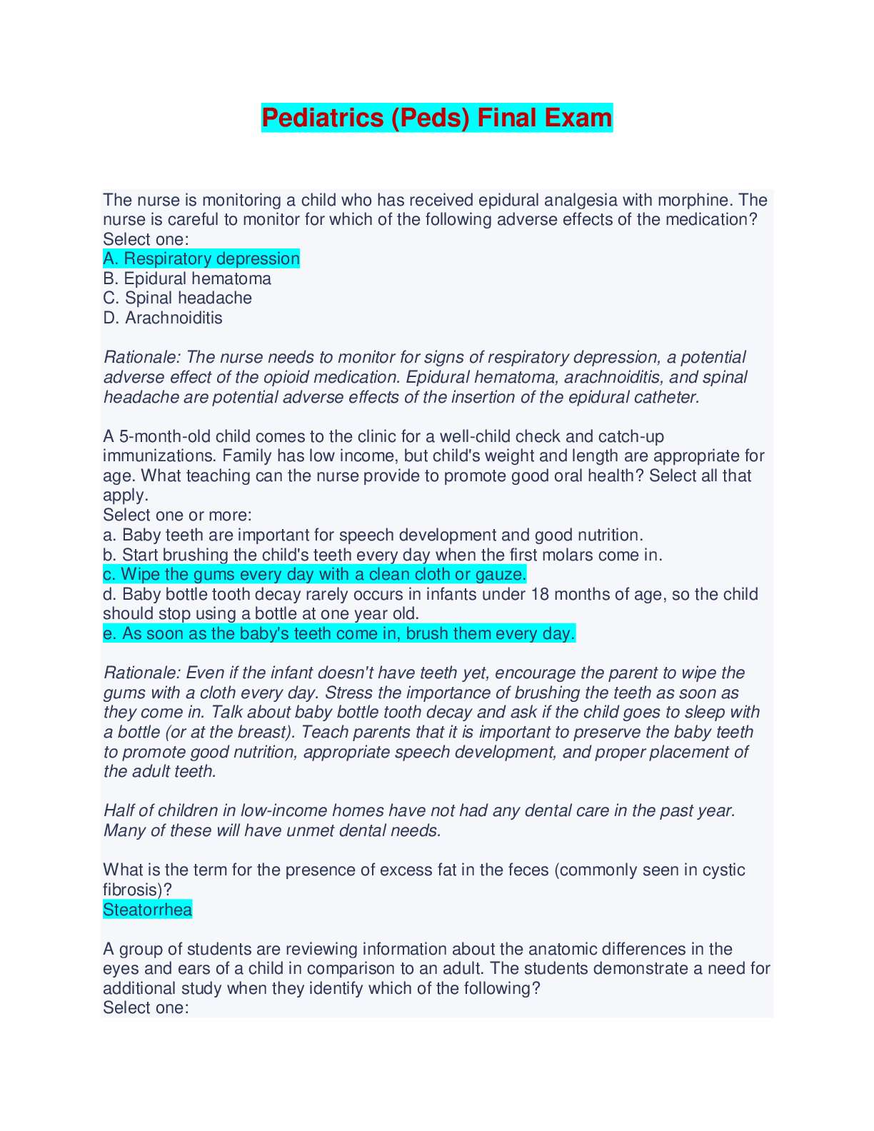 NURSING PEDIATRICS > EXAMs > Pediatrics (Peds) Final Exam - Questions, Answers and Rationales (All)