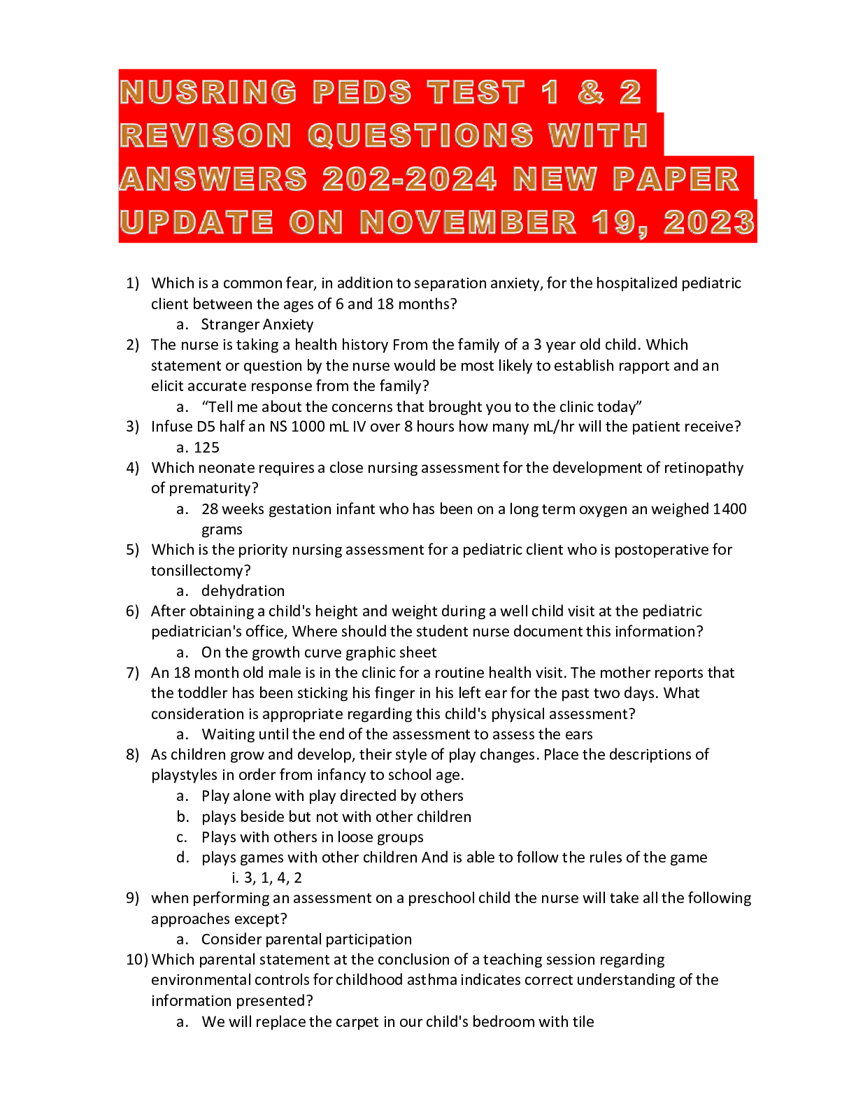 NURSING PEDIATRICS > EXAMs > NUSRING PEDS TEST 1 & 2 REVISON QUESTIONS WITH ANSWERS 202-2024 NEW PAPER UPDATE ON NOVEMBER 19, 2023 (All)