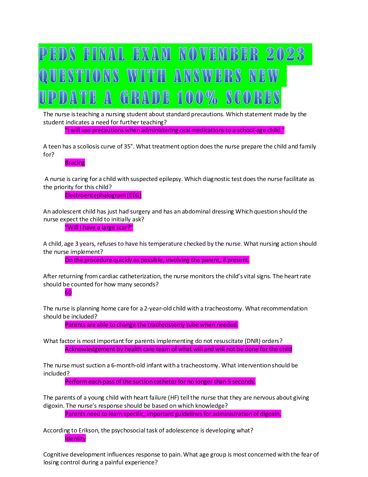 NURSING PEDIATRICS > EXAMs > PEDS FINAL EXAM NOVEMBER 2023 QUESTIONS WITH ANSWERS NEW UPDATE A GRADE 100% SCORES (All)