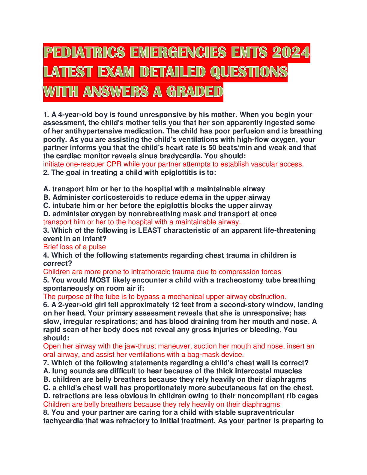NURSING PEDIATRICS > EXAMs > PEDIATRICS EMERGENCIES EMTS 2024 LATEST EXAM DETAILED QUESTIONS WITH ANSWERS A GRADED (All)