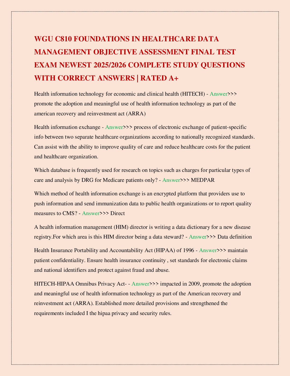 WGU C785 > EXAM > WGU C810 FOUNDATIONS IN HEALTHCARE DATA MANAGEMENT OBJECTIVE ASSESSMENT FINAL TEST EXAM NEWEST 2025/2026 COMPLETE STUDY QUESTIONS WITH CORRECT ANSWERS | RATED A+ (All)