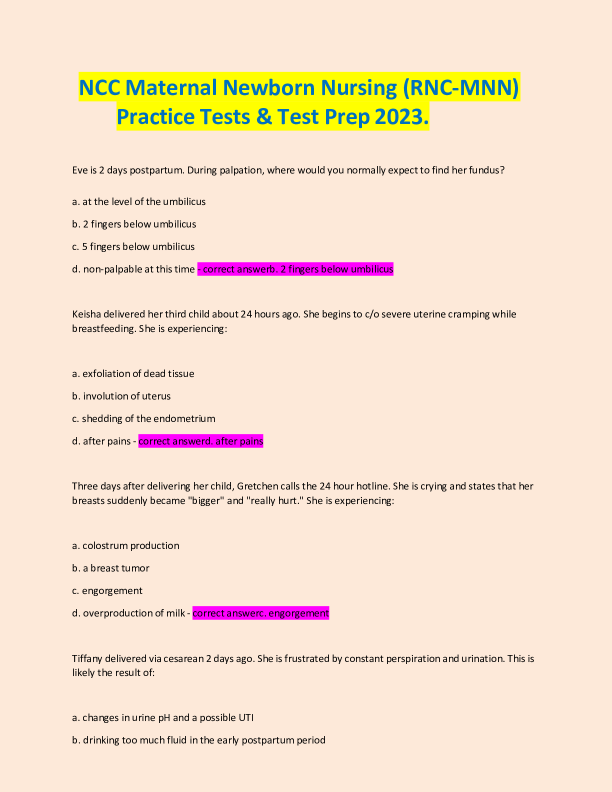 nursing care > EXAMs > NCC Maternal Newborn Nursing (RNC-MNN) Practice Tests & Test Prep 2023. (All)